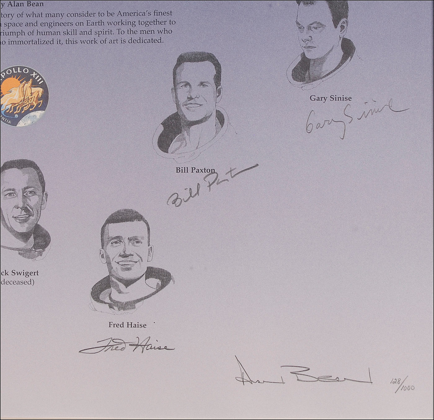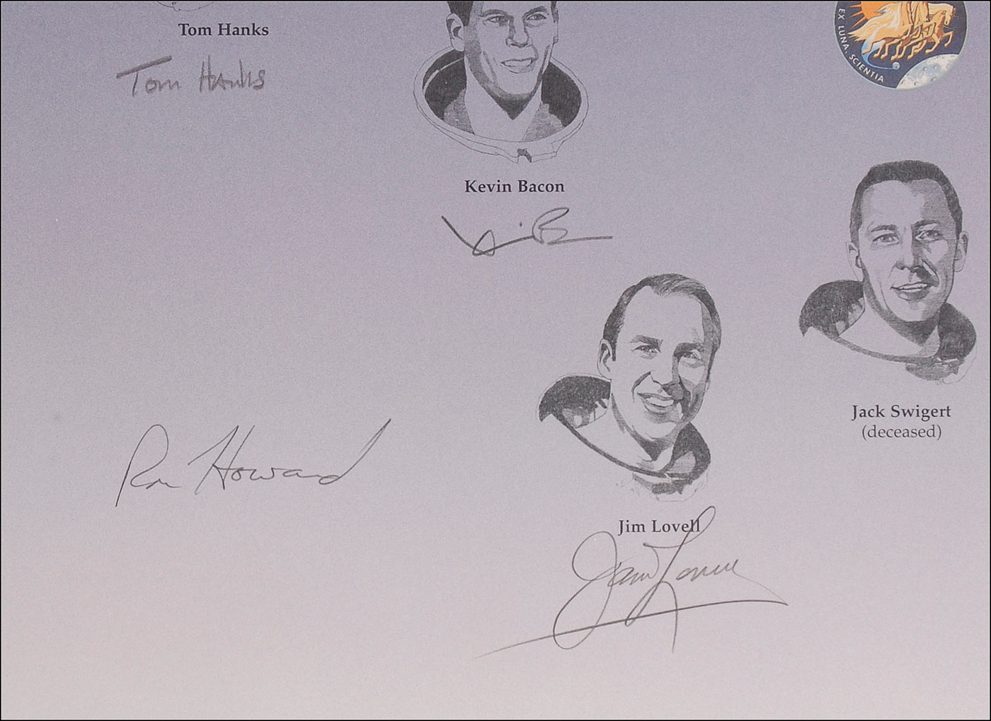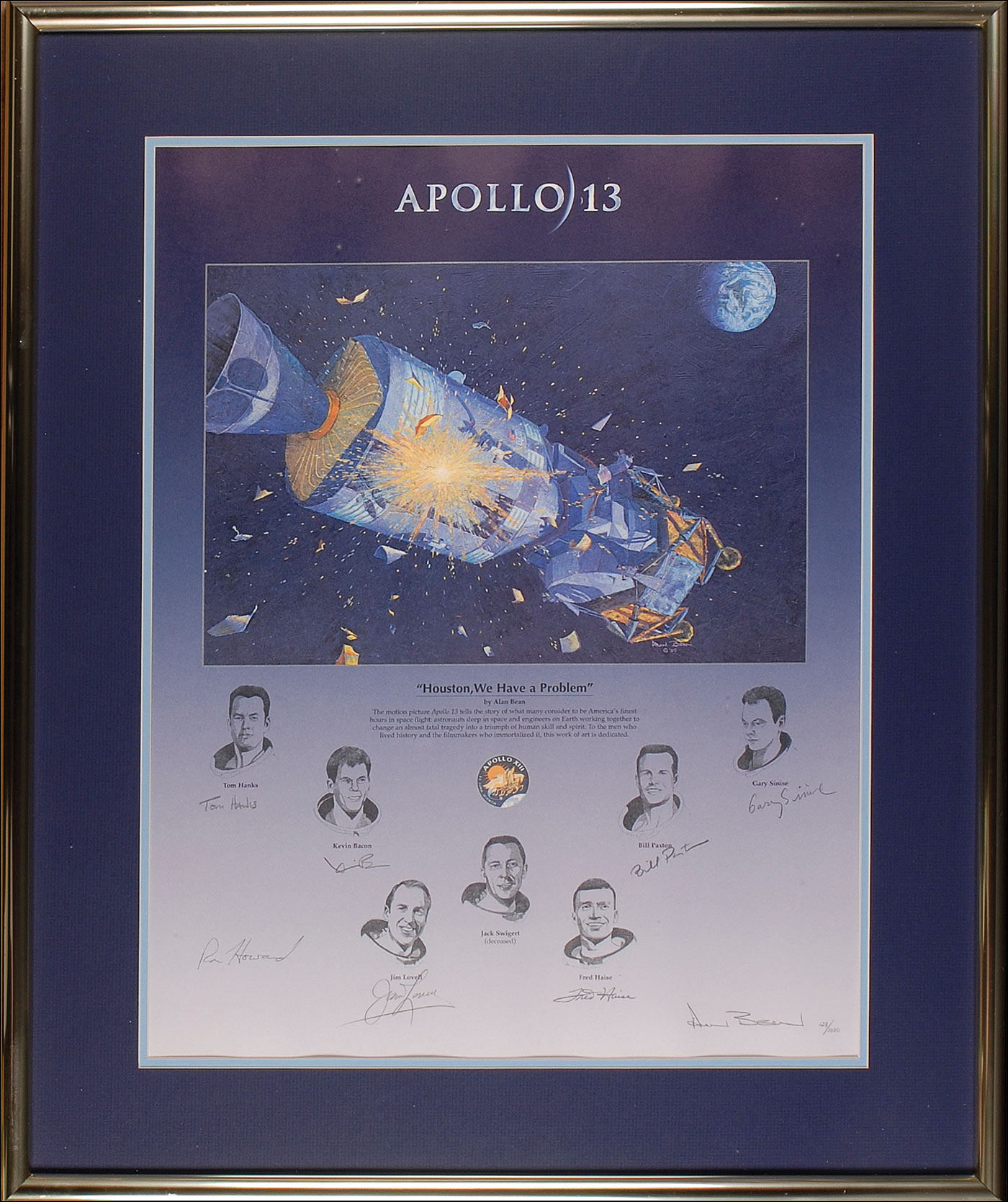 Color 17.5 x 22.5 lithograph entitled ‘Houston, We Have a Problem,’ featuring an image of the accident done by Alan Bean, numbered #128/1000, and signed in pencil by astronauts James Lovell, Fred Haise, and Alan Bean, as well as actors Tom Hanks, Bill Paxton, Kevin Bacon, Gary Sinise, and the director of Apollo 13, Ron Howard. Double matted and framed to an overall size of 25.25 x 30.5. In fine condition. A great combination of the astronauts who lived it and those who told their inspiring story.