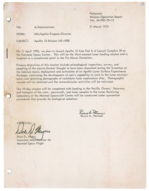 Apollo 13 pre-launch mission memo, one page, 8 x 10.5, dated March 31, 1970, bearing printed signatures of Rocco A. Petrone and Dale D. Myers, providing a brief overview of the planned Apollo 13 mission, including objectives and extravehicular activities all the way to splashdown. Memo is stapled to the front cover of a 46-page Apollo 13 Mission Operation report, including the experiments, moonwalks, and other activities during the 10-day mission. As a result of the malfunction, the whole operating plan was thrown out the window as the moon mission soon became a rescue mission.