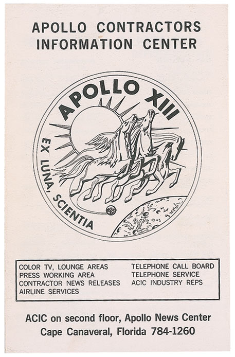 Brochure entitled Apollo Contractors Information Center, 5.5 x 8.5, 4 pages. The publication identified contractors and contact information for prime contractors and subcontractors working on the Apollo 13 mission. Light handling wear.