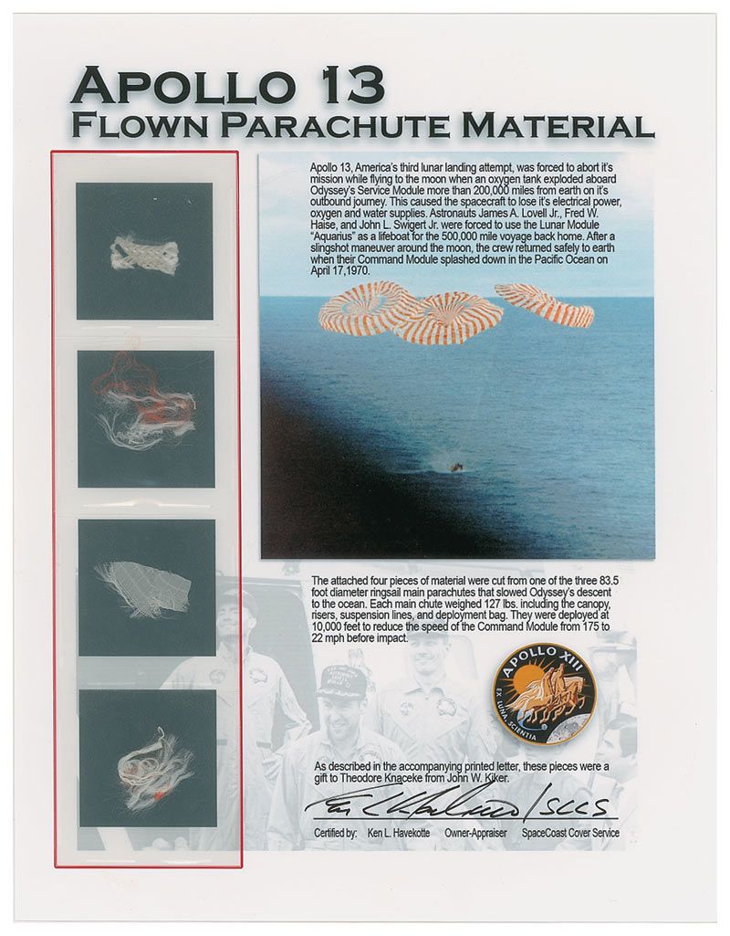 Four different flown swatches of material cut from one of the three ringsail main parachutes that slowed the Odyssey’s decent as it splashed down on the Pacific Ocean, with all four affixed to an informational sheet and certificate of authenticity from Ken Havekotte.