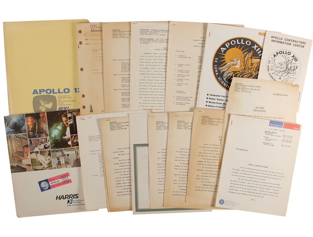 Collection of 16 pieces of pre-flight information for the Apollo 13 mission. Items include six press releases, three fact sheets, a memorandum, a brochure, and press kits from Harris Communications Technology, Teledyne, Westinghouse News, RCA News, and Western Union International. In very good condition, with scattered toning and handling wear.