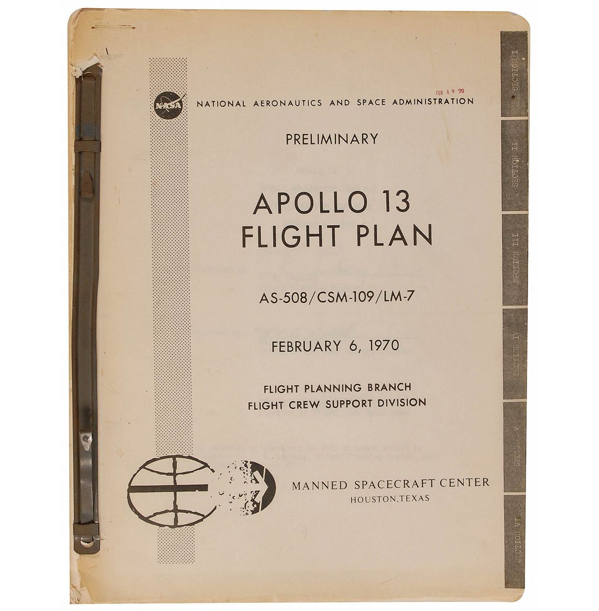Printed and bound preliminary Apollo 13 Flight Plan, “AS-508/CSM-109/LM-7,” dated February 6, 1970, measuring 8.5 x 11, and providing a minute-by-minute time frame for the entire mission, including the test of the lunar module. First page is a copy of the flight plan submission bearing copies of signatures of T. R. Lindsey, Warren J. North, and Deke Slayton. In very good condition, with scattered toning and soiling, a few small edge tears, and expected handling wear. Plan originates from noted test pilot Robert Rahn, who was employed by North American Rockwell, which was making the command module. He used his expertise to determine how the astronauts would want the controls, displays, and equipment configured in the capsule. When Columbia, Apollo 11's CM, was completed, he was assigned to help that crew of astronauts become familiar with it. It was also Rahn who appeared on live television on ABC at the beginning of the Apollo 13 emergency, correcting several sensational inaccuracies originally reported. Accompanied by a hardcover copy of Rahn’s memoir, Tempting Fate.