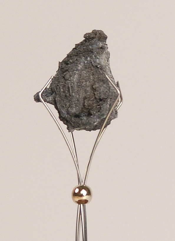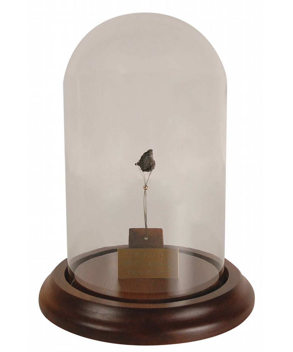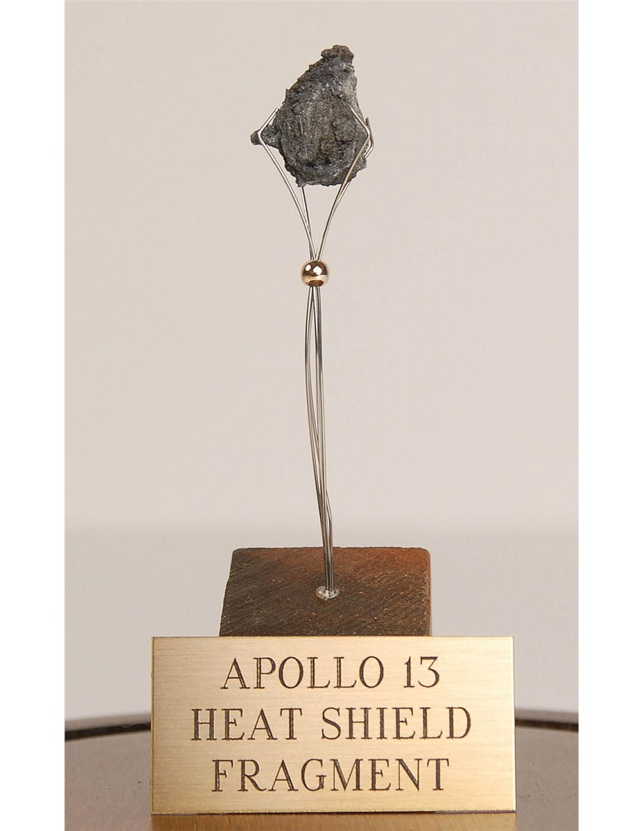 Flown core sample removed from the heat shield of the Apollo 13 command module. The sample measures approximately .5 x .5 x .5 and has one smooth edge where the sample was removed from the heat shield. Sample is held by a metal claw suspended above a wooden base with a 1.5 x .75 brass plaque stating "Apollo 13 Heat Shield Fragment.” The base has a diameter of 5.5" and is housed in a glass dome measuring 7" high.