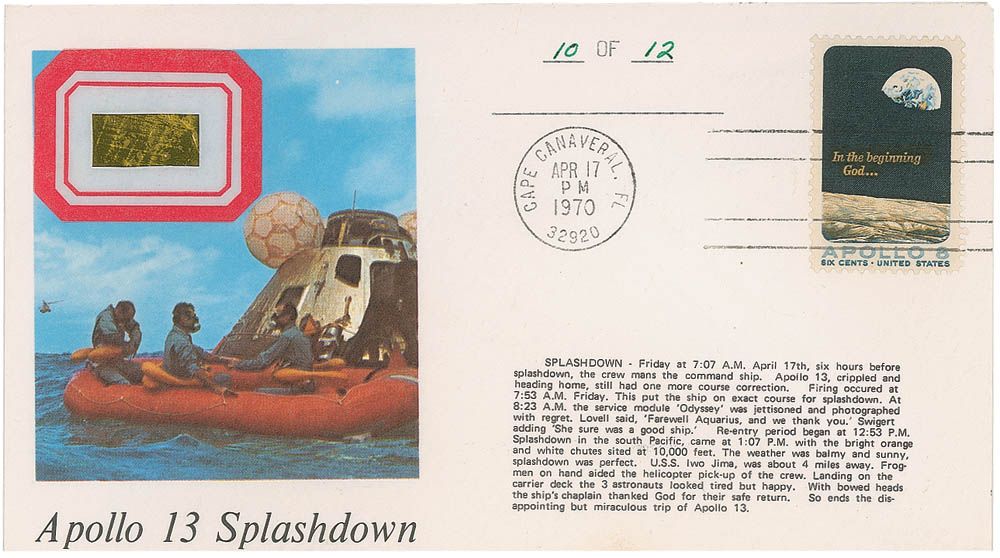A limited edition presentation of flown Kapton foil from the Apollo 13 command module, #10/12, affixed to a commemorative cover bearing a cachet honoring Apollo 13’s return to Earth, and bearing an April 17, 1970, Cape Canaveral postmark. In fine condition.