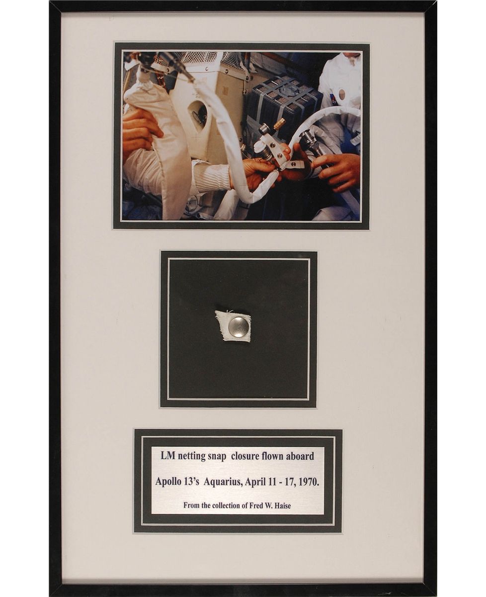 Flown Netting Snap Closure, flown on board Aquarius during the Apollo 13 mission. This one-half inch round metal female snap fastener is still attached to an approximately one-inch piece of the white Beta cloth strip it was originally attached to onboard the Apollo 13 Command Module. Nicely matted and framed with a color photo of the snap on the entire strap it was removed from and an engraved plaque that reads: "LM Netting snap closure flown aboard Apollo 13's ‘Aquarius,’ April 11-17, 1970. From the collection of Fred W. Haise." In fine condition. Provenance: Goldberg’s, October, 2007; Fred Haise Collection.