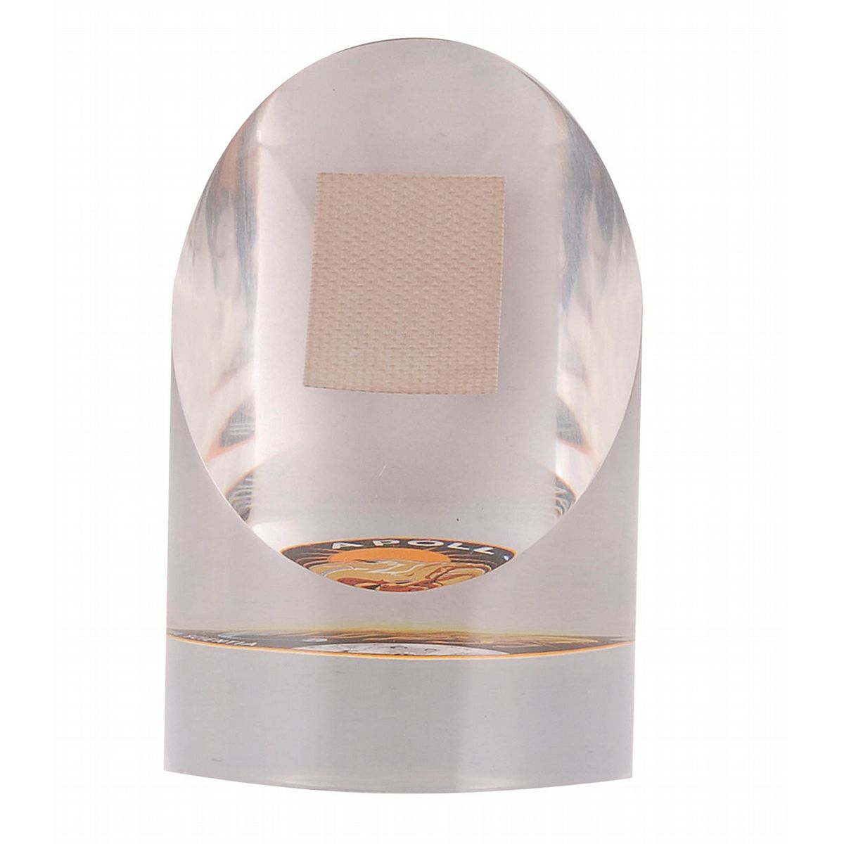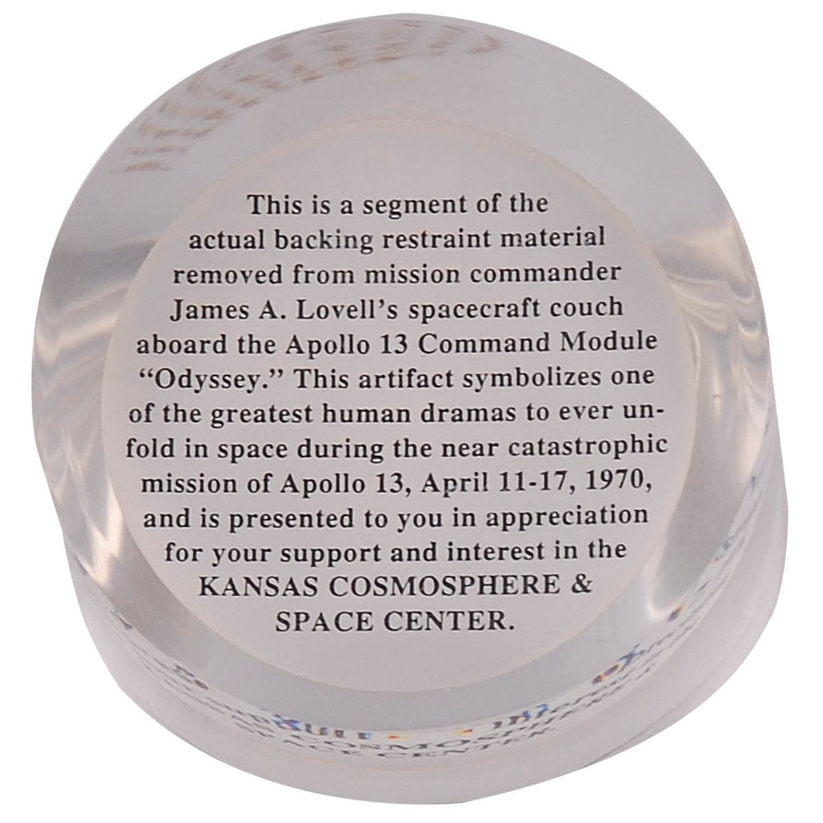 An approximately 1 x 1.5 swatch of backing restraint material removed from Commander Jim Lovell’s spacecraft couch aboard the Apollo 13 command module ‘Odyssey.’ Swatch is encased in a curved acryllic cylinder measuring 4 x 2.25. Bottom has an encased Apollo 13 color seal indicating material was originally presented by the Kansas Cosmosphere and Space Center. Accompanied by a certificate of authenticity from Max Ary, president of the Kansas Cosmosphere and Space Center.