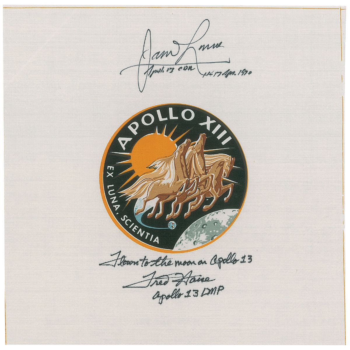 An 8 x 8 swatch of flown Beta cloth, with a 3.5? diameter Apollo 13 mission emblem printed in the center, flown into lunar orbit on board the Apollo 13 mission. Signed in black felt tip, “Flown to the moon on Apollo 13, Fred Haise, Apollo 13 LMP,” and “James Lovell, Apollo 13 Cdr—11-17 Apr. 1970.” In fine condition.