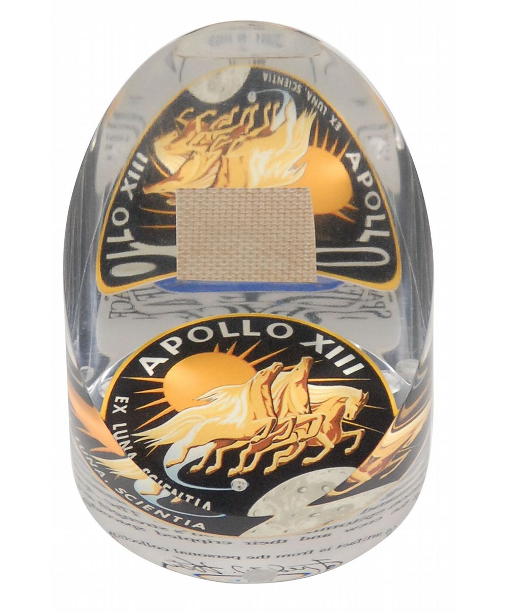 Flown swatch of fabric from the backing material of the astronauts’ couches inside the Apollo 13 Command Module, approximately 1 x .5, encased in a cylindrical 2.75 x 3.25 piece of Lucite cut at an angle for display purposes, with an Apollo 13 emblem and certificate of authenticity at the bottom. A limited edition piece, numbered 158/200, originally distributed through the Astronaut Scholarship Foundation. In fine condition. Accompanied by a matching laminated certificate of authenticity signed by astronaut Fred Haise certifying that it is a piece from his personal collection.