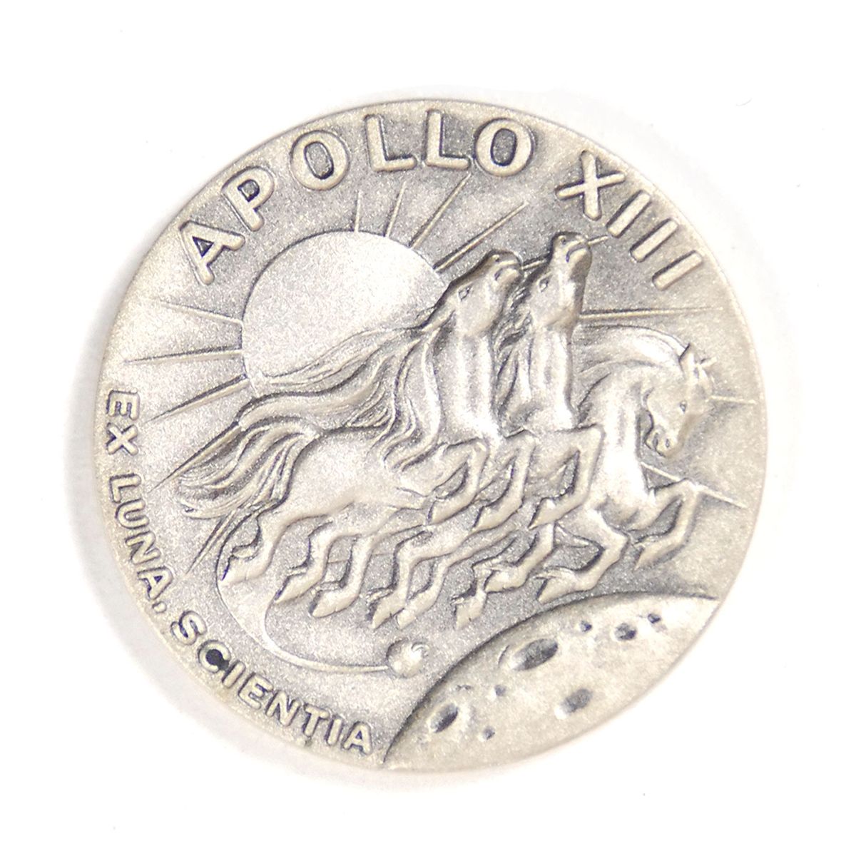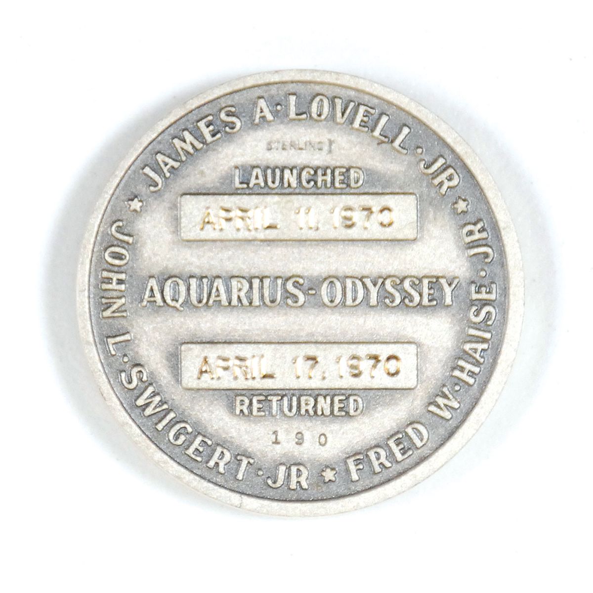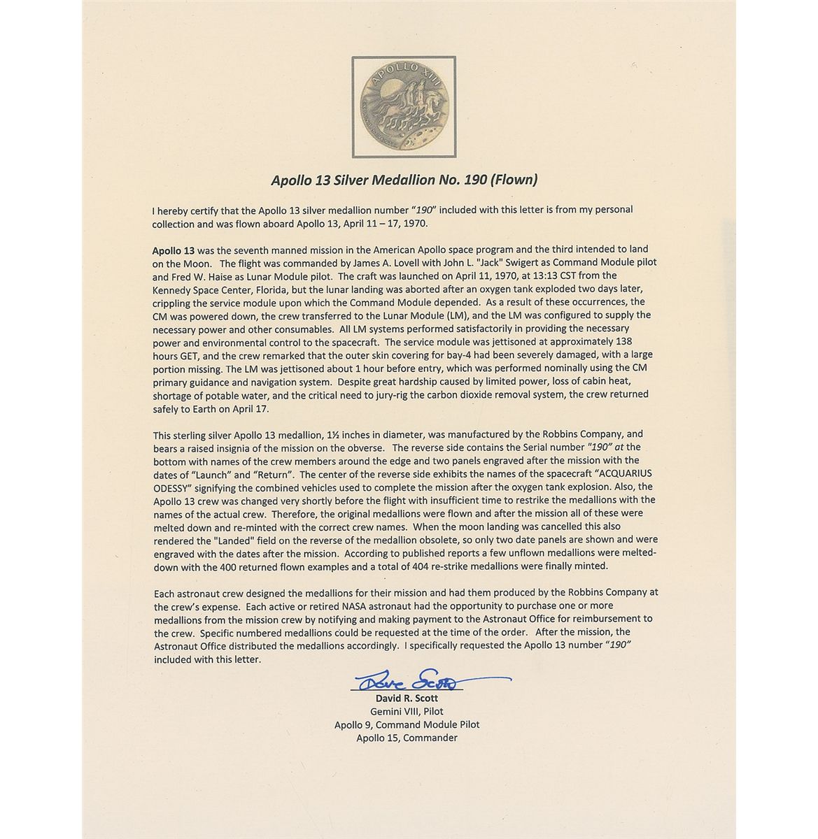 Flown Apollo 13 Robbins Medal, approximately 1.25 diameter, with a raised design on the face of the Apollo 13 mission insignia. The reverse of the sterling silver medal is engraved with the full names of astronauts Jim Lovell, Fred Haise, and Jack Swigert, along with spacecraft names Aquarius and Odyssey, the April 11, 1970, launch date, and April 17, 1970, return date. This medal is serial numbered “190.” Condition is mint state. Encapsulated in a plastic NGC holder [official grading and images of Robbins medal in holder available online at rrauction.com]. Medal is accompanied by its original case, numbered “190.” Accompanied by a letter of authenticity from Dave Scott stating, in part: “I hereby certify that the Apollo 13 silver medallion numbered ‘190’ included with this letter is from my personal collection and was flown aboard Apollo 13, April 11-17, 1970…After the mission, the Astronaut Office distributed the medallions accordingly. I specifically requested the Apollo 13 number ‘190’ included with this letter.” The Apollo 13 Robbins holds the distinction of being somewhat different than all of their other mission counterparts. Because of the last minute change to the crew (Jack Swigert for Ken Mattingly) all of the flown medals were melted down after the mission and new ones struck from the metal.