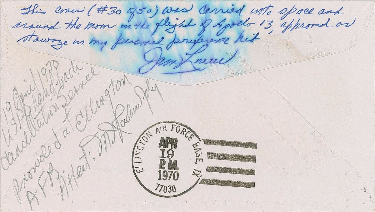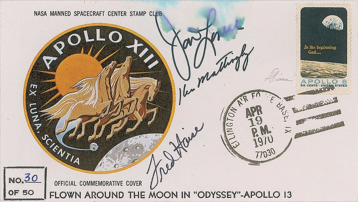 Exceptionally rare flown Apollo 13 commemorative cover carried on board the command module Odyssey by commander James Lovell, 6.5 x 3.5, bearing a color cachet of the mission insignia with a stamped limited edition box in the lower left corner, numbered 30/50, postmarked on the front and reverse, Ellington Air Force Base, Texas, April 19, 1970, and signed in black felt tip by Lovell, Ken Mattingly, and Fred Haise. Also signed and flight-certified by Lovell on the flap in blue ballpoint, “This cover (#30 of 50) was carried into space and around the moon on the flight of Apollo 13 approved as storage in my personal preference kit, James Lovell.” Additionally, the lower left reverse is signed and certified in pencil by former NASA Manned Spacecraft Center Stamp Club President Matthew I. Radnofsky, a NASA engineer who aided in the preparation of the Apollo 13 PPK covers, in full: “19 April 1970, USPO hand-back cancellation service provided at Ellington, AFB. Attest: M. I. Radnofsky.” In very good to fine condition, with Lovell’s signature on the front, and his notation on the back flap, affected by one time exposure to moisture. An incredibly rare and sought-after item that marks the first such example of a flown Apollo 13 cover we have ever offered at auction.