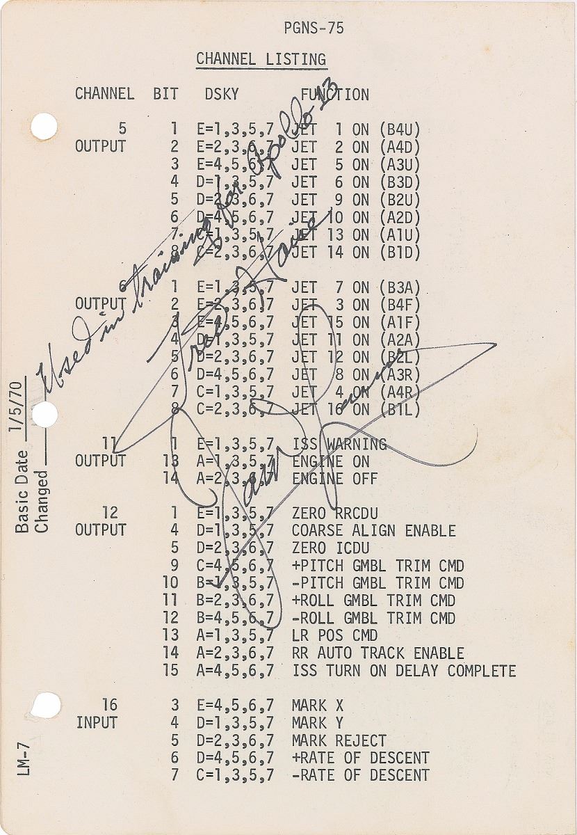 Double-sided page removed from the Apollo 13 Lunar Module Flight Crew G & N Dictionary, 5.5 x 8, with a basic date of January 5, 1970, signed on one side in black felt tip, “Used in training for Apollo 13, Fred Haise” and “James Lovell.” Consisting of pages 75 and 76, the section is headed “Channel Listing,” and features “BIT,” “DSKY,” and “Function” instructions for outputs 5, 6, 11, and 12, input 16, inverted inputs 30 and 31, and inverted 32. In fine condition.