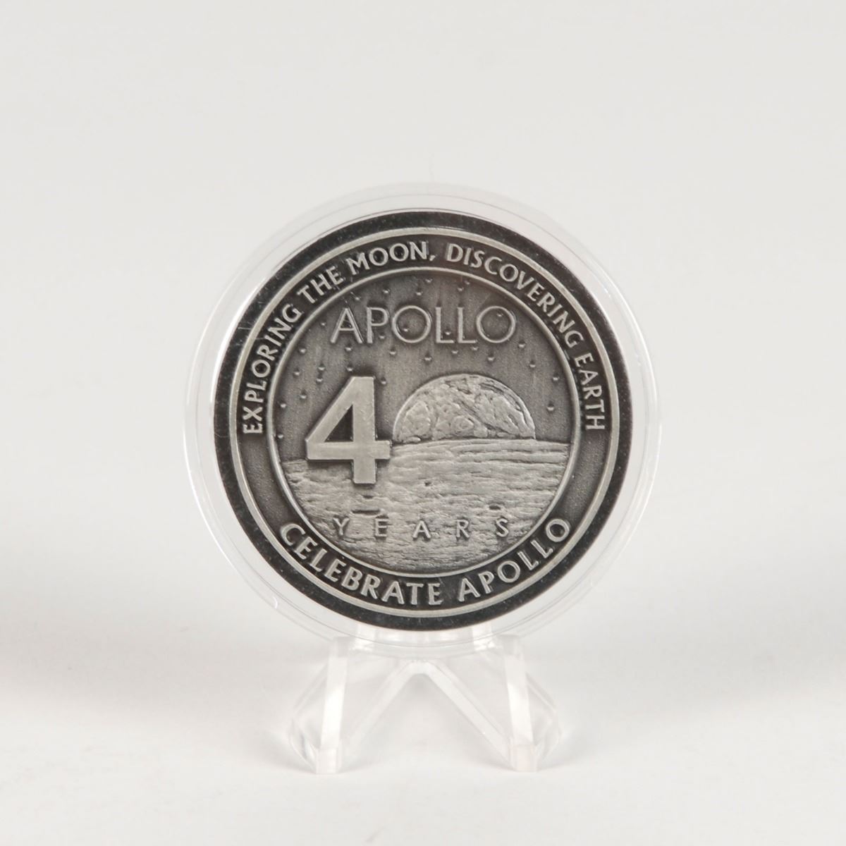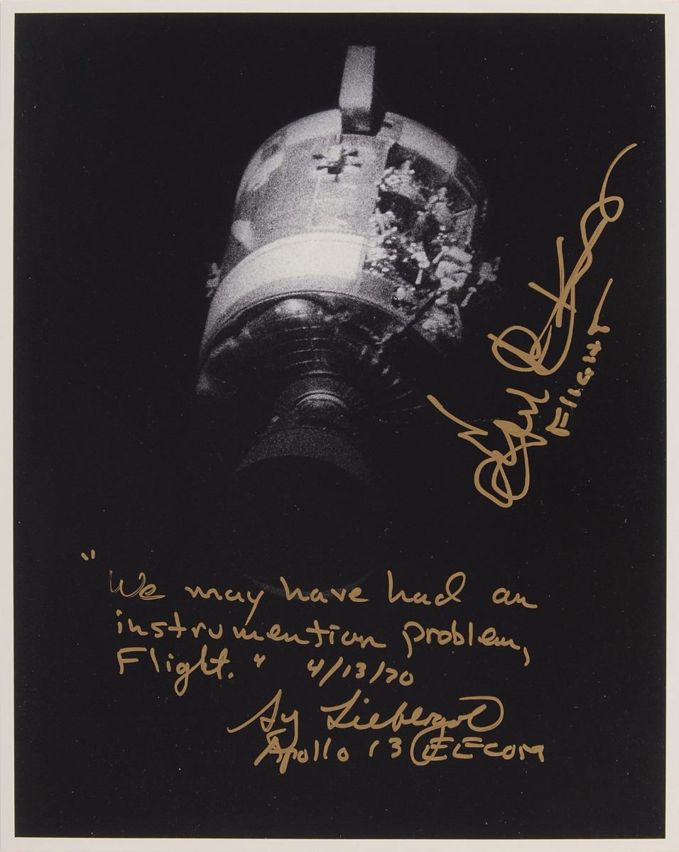 Color satin-finish 8 x 10 photo of the damaged Apollo 13 capsule, signed in gold ink, "Gene Kranz, Flight" and "'We may have had an instrumentation problem, Flight.' 4/13/70, Sy Liebergot, Apollo 13 EECOM." In fine condition. Accompanied by a Winco medallion commemorating Apollo 13, minted using metal containing material flown to the moon during the Apollo program. Pre-certified Zarelli Space Authentication.