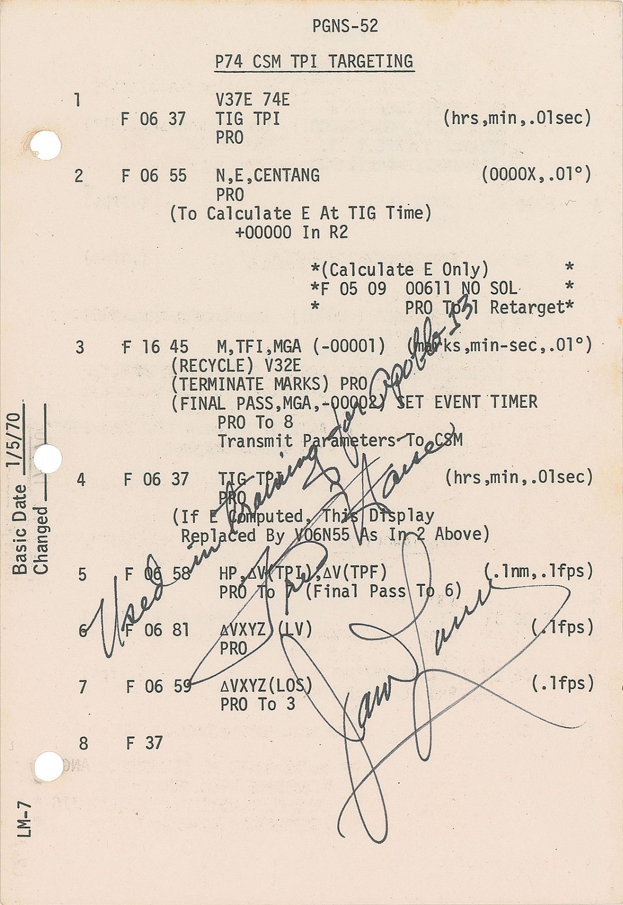 Double-sided page removed from the Apollo 13 Lunar Module Flight Crew G & N Dictionary, 5.5 x 8, listing a basic date of January 5, 1970, signed on one side in black felt tip, “Used in training for Apollo 13, Fred Haise” and “James Lovell.” Consisting of pages 52 and 53, the front side is headed “P74 CSM TPI Targeting,” and the other side is headed “P75 CSM TPM Targeting” and “P76 Target V.” In fine condition. Originating from the Astronaut Scholarship Foundation, a portion of the proceeds for the sale of this item will be donated to the ASF.