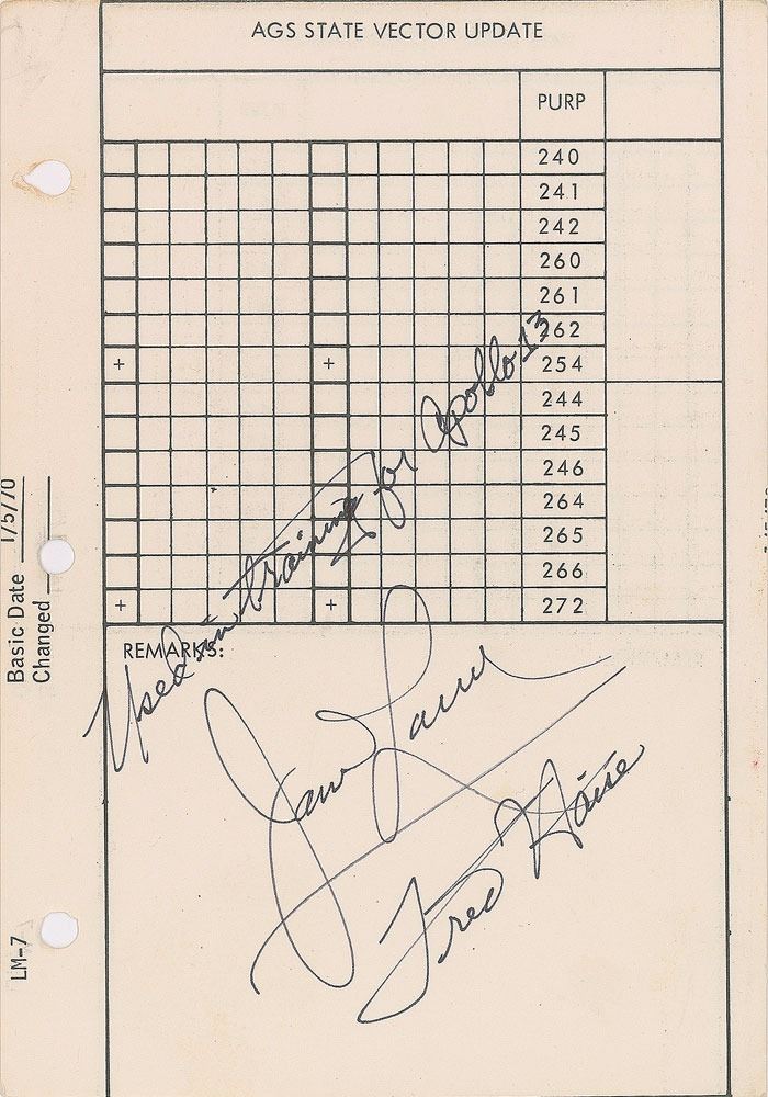 Double-sided page removed from the Apollo 13 Lunar Module Flight Crew G & N Dictionary, 5.5 x 8, listing a basic date of January 5, 1970, signed on one side in black felt tip, “Used in training for Apollo 13, Fred Haise” and “James Lovell.” Both sides are headed “AGS STATE VECTOR UPDATE” and list a row of “PURP” numbers ranging from 240 to 272, with “Remarks” fields below. In fine condition. Originating from the Astronaut Scholarship Foundation, a portion of the proceeds for the sale of this item will be donated to the ASF.