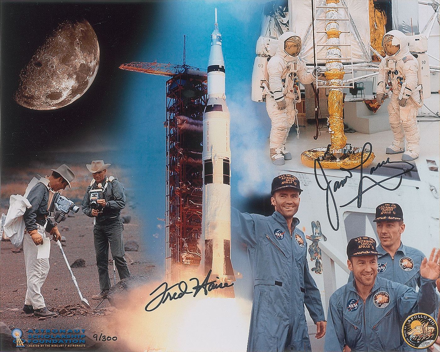 Limited edition color semi-glossy 10 x 8 photo honoring the 35th anniversary of the Apollo 13 mission, numbered 9/300, signed in black felt tip by James Lovell and Fred Haise. In fine condition. Accompanied by two certificates of authenticity from the Astronaut Scholarship Foundation, indicating that the signatures were obtained at the 2005 US Astronaut Hall of Fame inductions.
