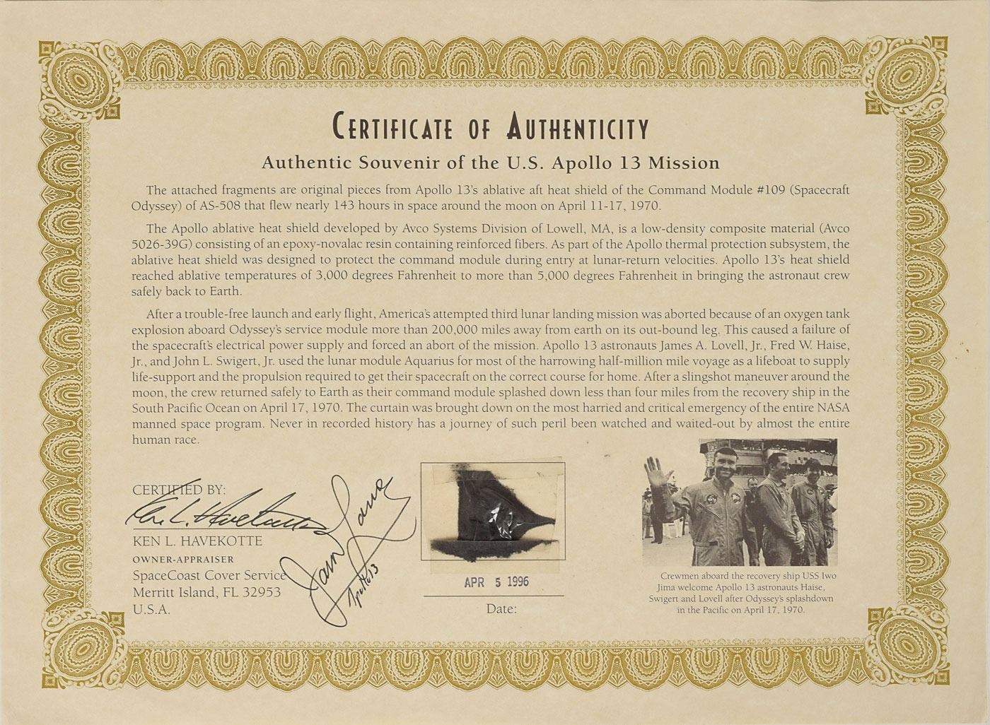 Small package of flown fragments from the Apollo 13 command module Odyssey's ablative aft heat shield, affixed to an 11 x 8.5 certificate of authenticity, dated April 5, 1996, signed in black ink by James Lovell, who adds, "Apollo 13," and by aerospace memorabilia specialist Ken Havekotte, stating that the "attached fragments are original pieces from Apollo 13's ablative aft heat shield of the Command Module #109 (Spacecraft Odyssey) of AS-508 that flew nearly 143 hours in space around the moon on April 11-17, 1970." In fine condition. Accompanied by a photo of Lovell taken at the time of signing, as well as a CD-ROM disc containing moments from the same event.