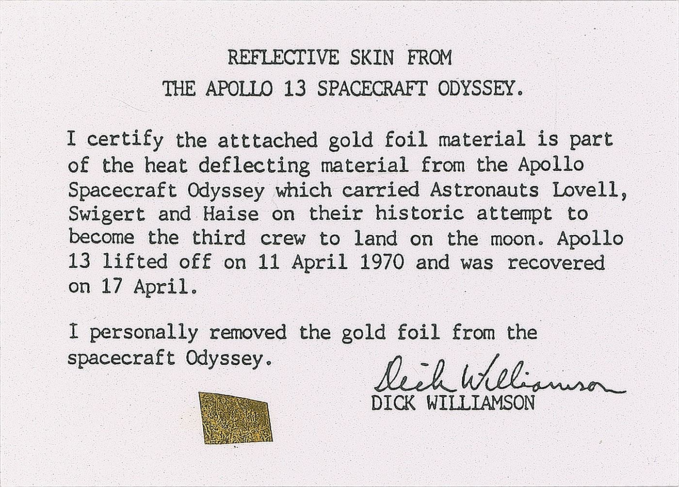 A flown .25 x .25 swatch of Kapton foil removed from the Apollo 13 Command Module Odyssey. The foil is affixed to a 3.5 x 2.5 presentation sheet bearing a preprinted signature of NASA Photographic Team member Dick Williamson, in part: “I certify the attached gold foil material is part of the heat deflecting material from the Apollo Spacecraft Odyssey…I personally removed the gold foil from the spacecraft Odyssey." In fine condition.