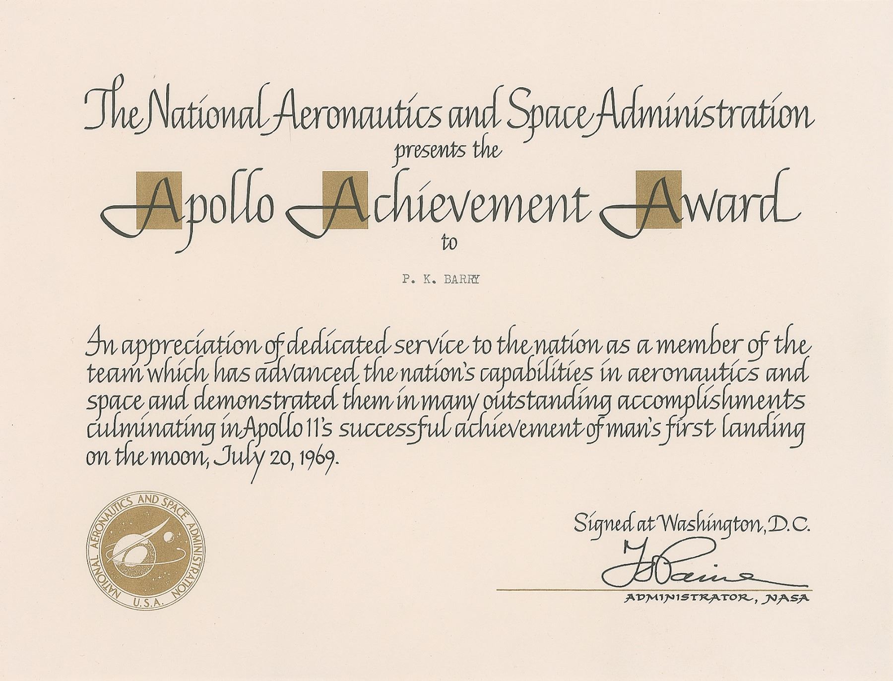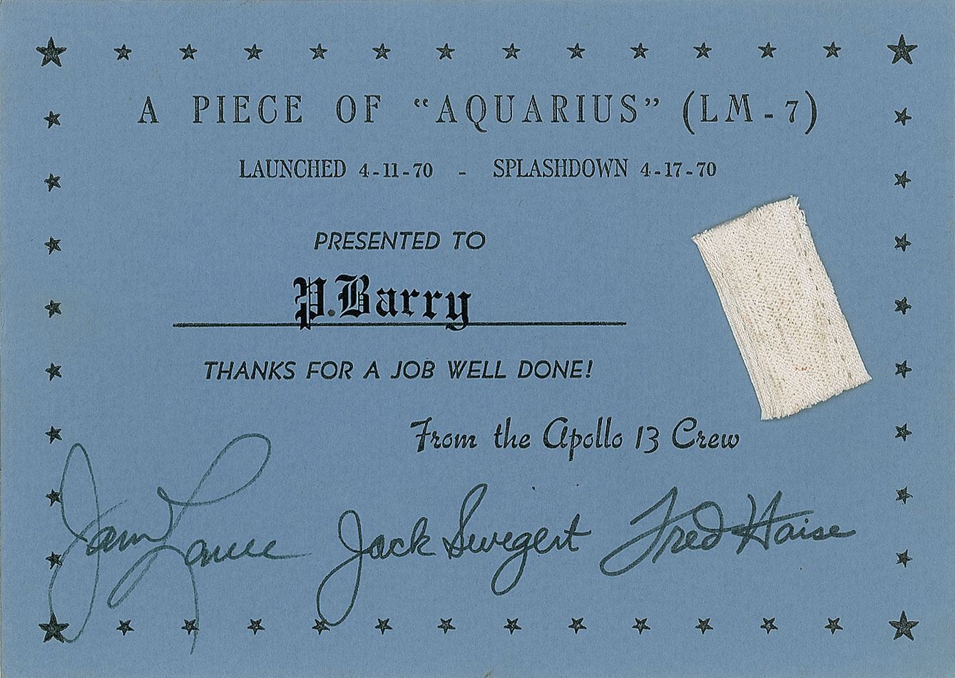 Fantastic flown .75 x 1.5 swatch of fabric from the Apollo 13 LM Aquarius, affixed to a 7 x 5 presentation card signed in black felt tip by the crew, "James Lovell," "Jack Swigert," and "Fred Haise." The card reads: "A Piece of 'Aquarius' LM-7, Launched April 11, 1970, Splashdown April 17, 1970, Presented to P. Barry, Thanks for a job well done! From the Apollo 13 crew." In fine condition. Accompanied by an "Apollo Achievement Award" presented by NASA to P. K. Barry "as a member of the team which has advanced the nation's capabilities in aeronautics and space and demonstrated them in many outstanding accomplishments culminating in Apollo 11's successful achievement of man's first landing on the moon."