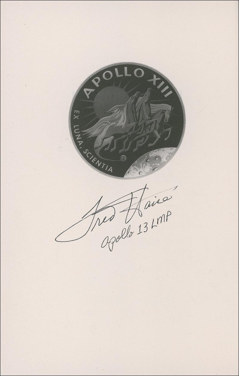 Signed book: Lost Moon. Later printing. Boston: Houghton Mifflin, 1994. Hardcover with dustjacket, 6.25 x 9.25, 378 pages. Signed on the first free end page in black felt tip by Ken Mattingly, on the title page in black ballpoint by James Lovell, and on the reverse of the half-title page in black ballpoint by Fred Haise. In very fine condition. Pre-certified Scott Cornish and RRAuction COA.