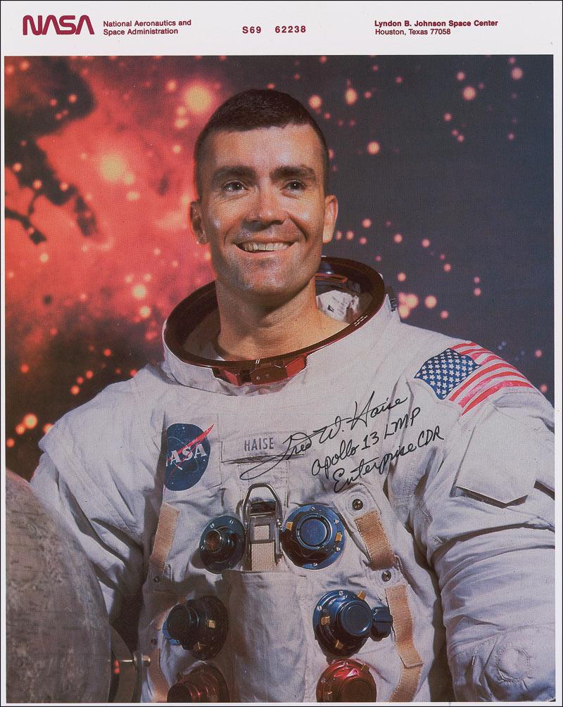 Color 8 x 10 NASA photo of James Lovell in his space suit against a celestial background, signed in black felt tip, “Reach for the Stars, James Lovell, Gemini 7, 12, Apollo 8, 13”; and a color 8 x 10 “red-lettered” NASA portrait of Fred Haise, signed in black ink, “Fred W. Haise, Apollo 13 LMP, Enterprise CDR.” In fine condition.