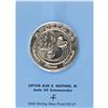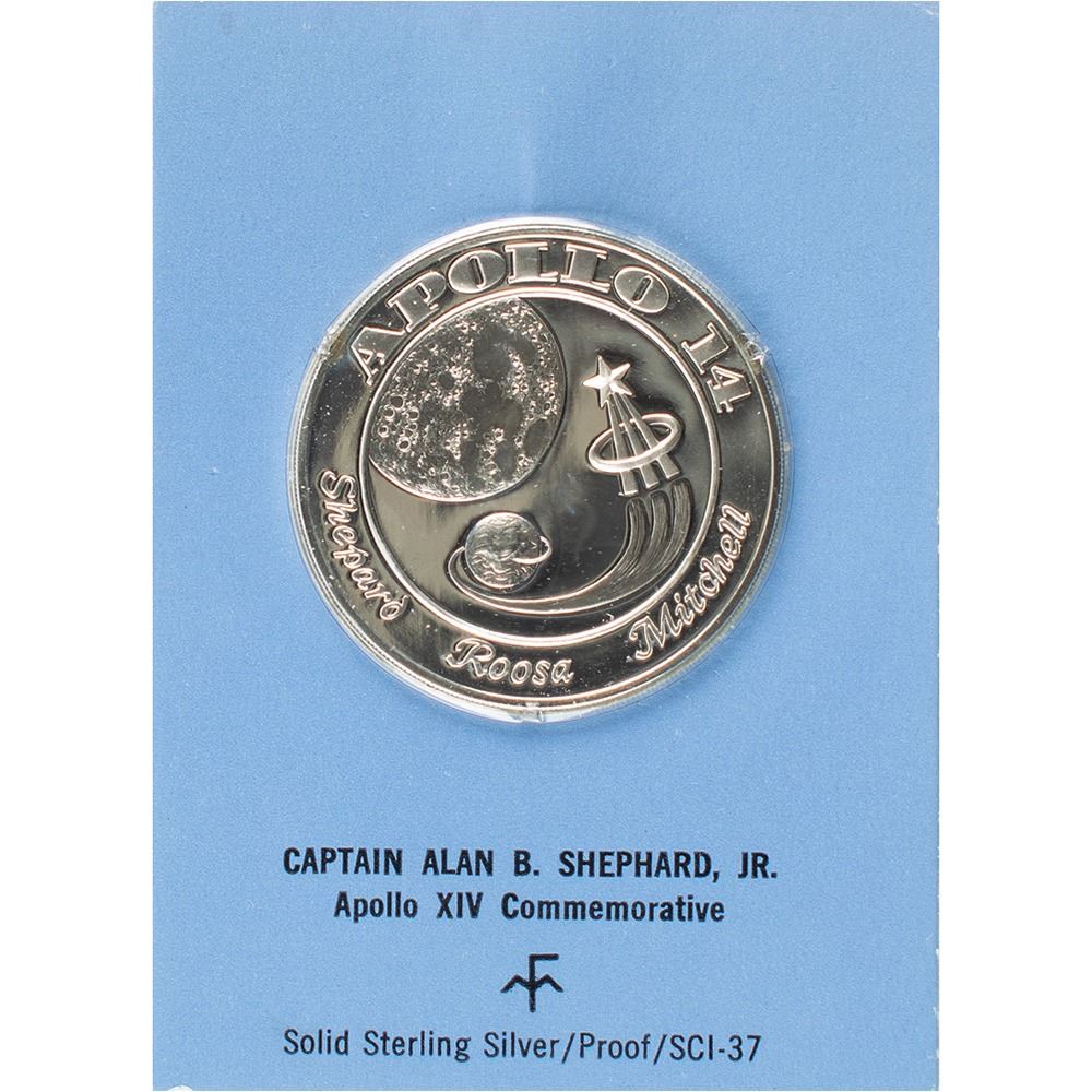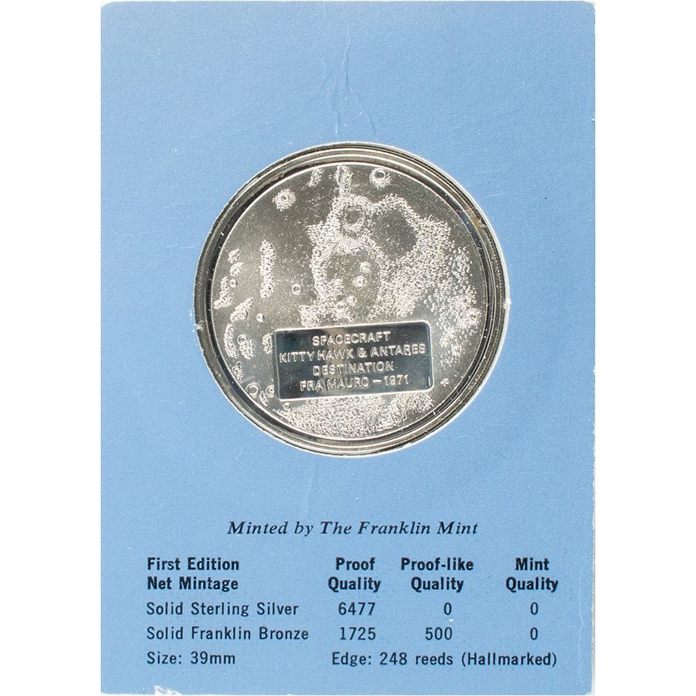 Solid sterling silver commemorative medal proof produced by the Franklin Mint to honor the historic flight of Apollo 14, 40 mm in diameter, featuring the mission insignia design on the face, and a map of the Fra Mauro landing site on the reverse. Displayed on its original backer card, noting a net mintage of 6477 proof-quality specimens. Also includes the original info card. In fine condition.