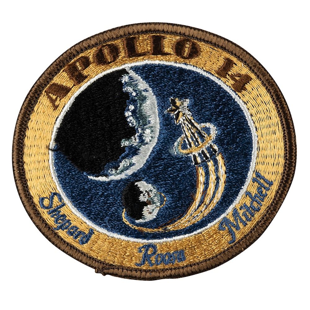 Uncommon Apollo 14 embroidered crew souvenir patch, 4" x 3.5", which features an astronaut lapel pin approaching the Moon and leaving a comet trail from the liftoff point on Earth, with gold border bearing "Apollo 14" in brown thread, and the surnames of the three crew members, "Shepard, Roosa, Mitchell," in blue thread. In fine condition.