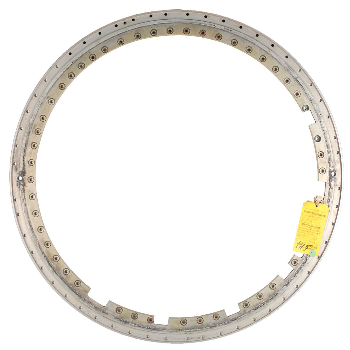Command Module docking ring flange machined from a solid sheet of high grade aluminum alloy, measuring 36 inches in diameter with two concentric sets of bolt holes and is numbered on the outside “V36-316250-31.” A North American Rockwell temporary parts removal tag is tied to the flange and filled out in a technician’s hand. Tag reads: “Part No. V36-316250-31 / Serial No: None / Authority: TPS112 Rem 97 / Model Number: Flange Docking Ring / Part No. V36-000003-141 / Serial Number: S/C 110…2/14/72.” In fine condition.