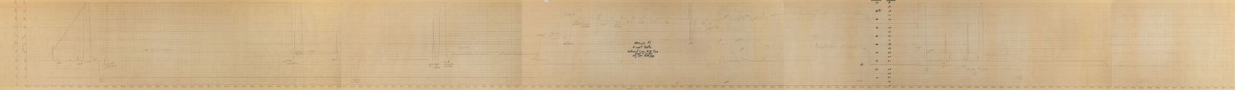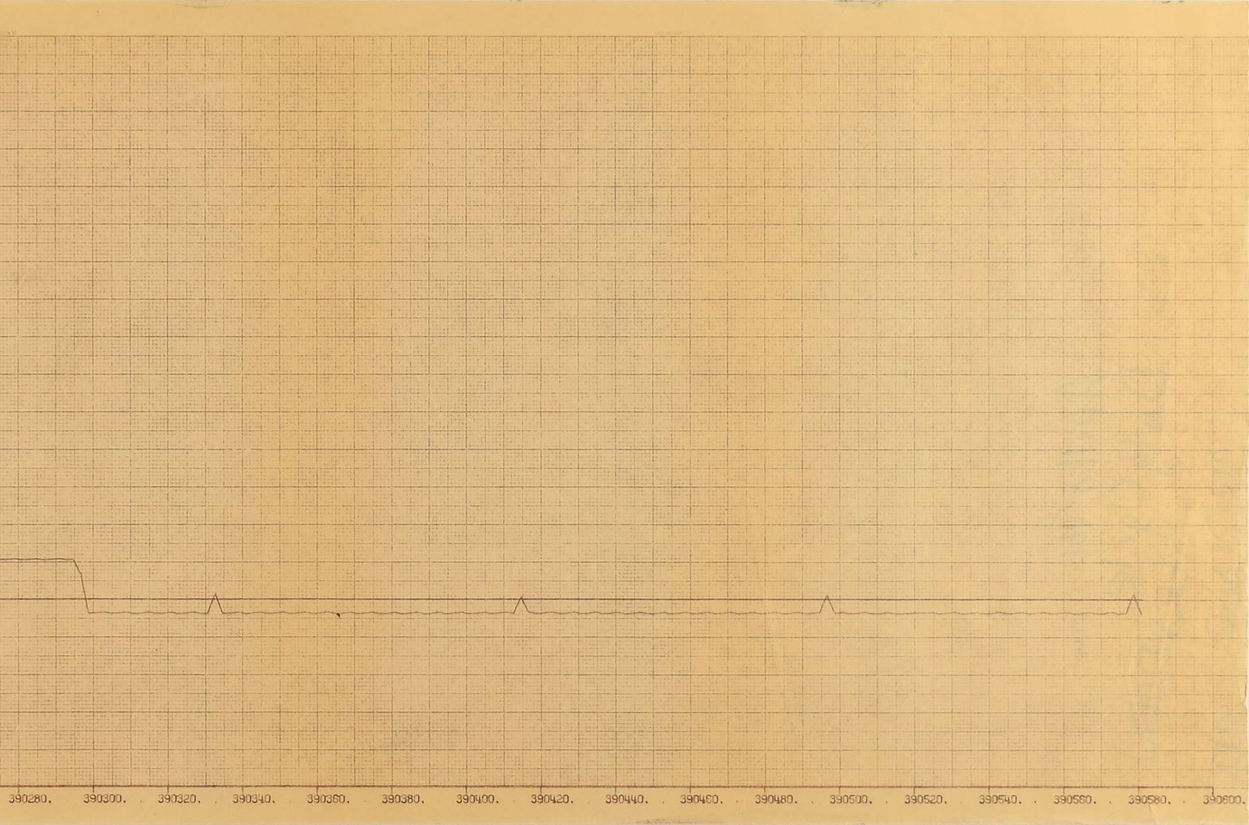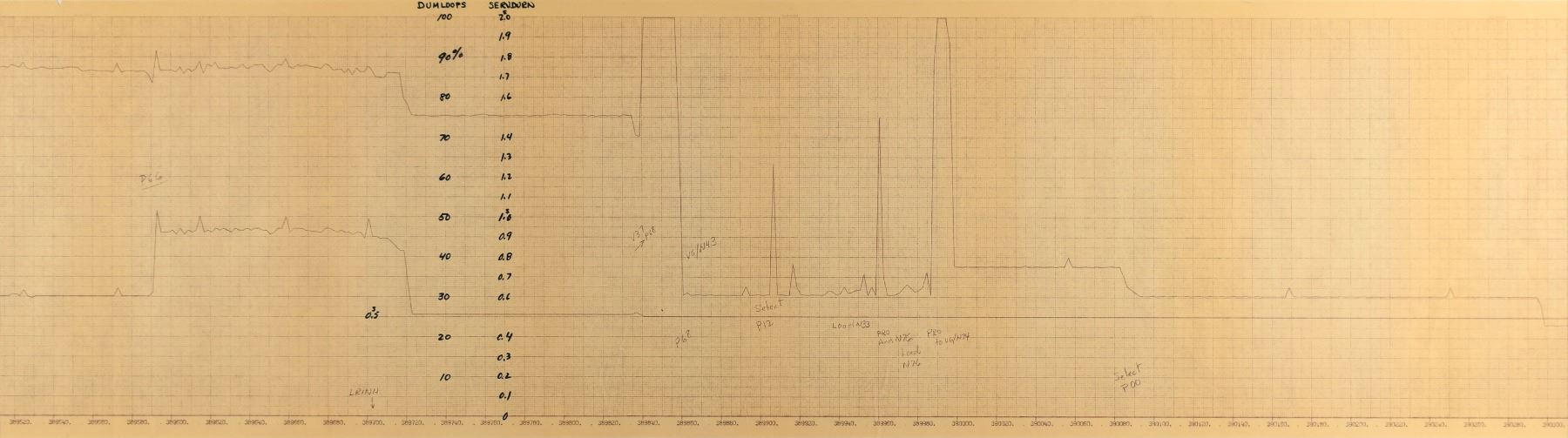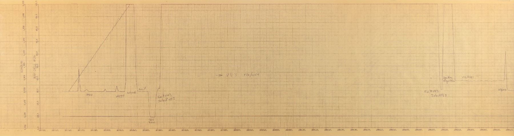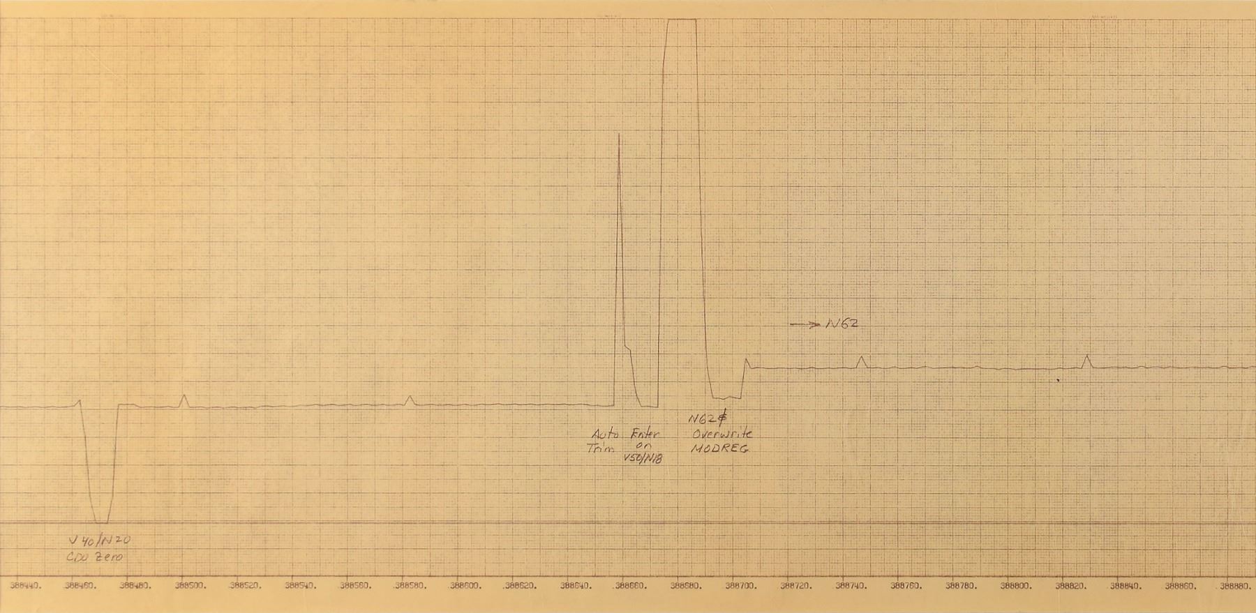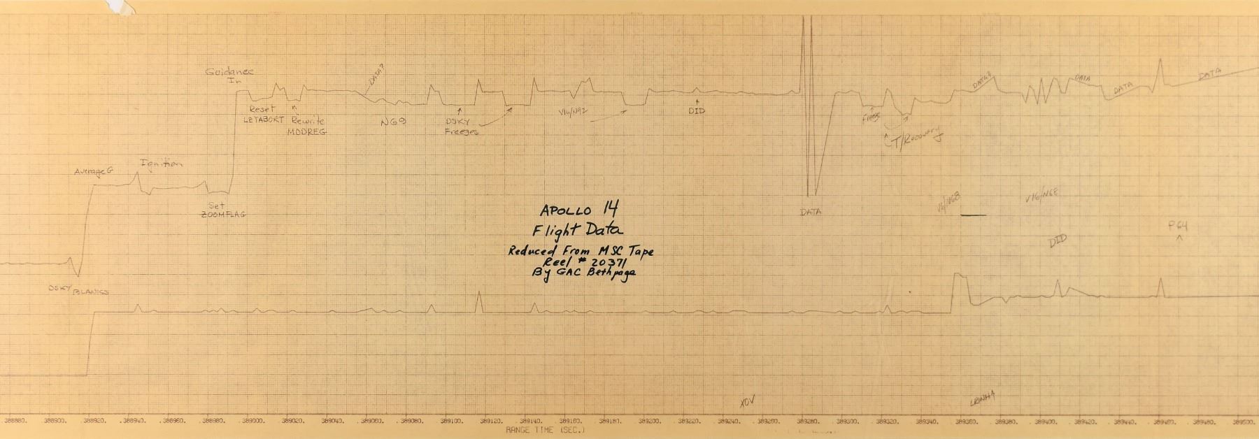 Historically significant chart of Apollo 14 dutycycle flight data, 155 x 11, representing the in-flight reprogramming of the guidance computer's abort routine. The chart plots "Duty Cycle (Pct)" and "SERVDURN" against "Range Time (Sec)," and is annotated at the center in black felt tip: "Apollo 14 Flight Data, Reduced from MSC Tape Reel #20371 by GAC Bethpage." The y-axis for "DUMLOOPS" and "SERVDURN" is also annotated in black felt tip to the right side. Areas on the chart are marked with verb-noun commands (for example: V47, V83, N69), and notes that chronicle the important masking of the abort button as the Apollo 14 LM prepared to land: "Ignition Algorithm," "Auto Trim," "N62 & Overwrite MODREG," "DSKY Blanks," "Set ZOOMFLAG," "Reset LETABORT," and "Rewrite MODREG." Rolled and in fine condition. The plotted information was available in mission control and was used to assess whether time-loss, such as caused the 1201 and 1202 alarms on Apollo 11, was impacting the computer's dutycycle.