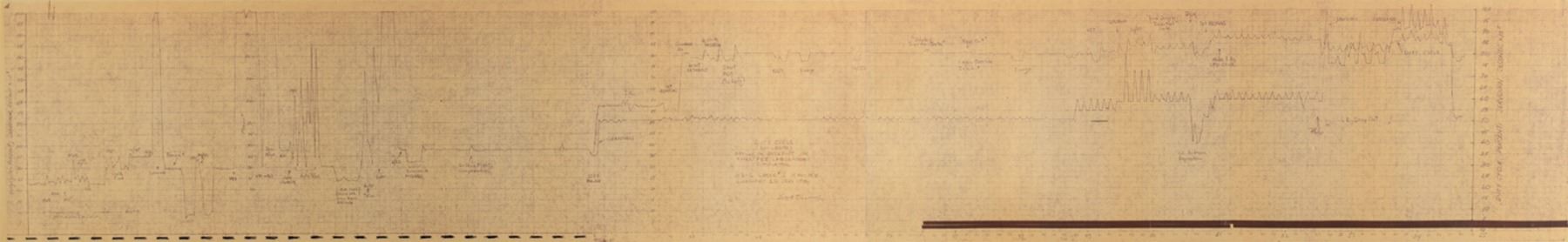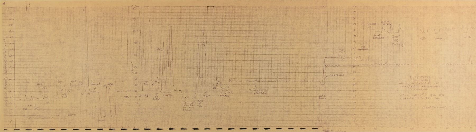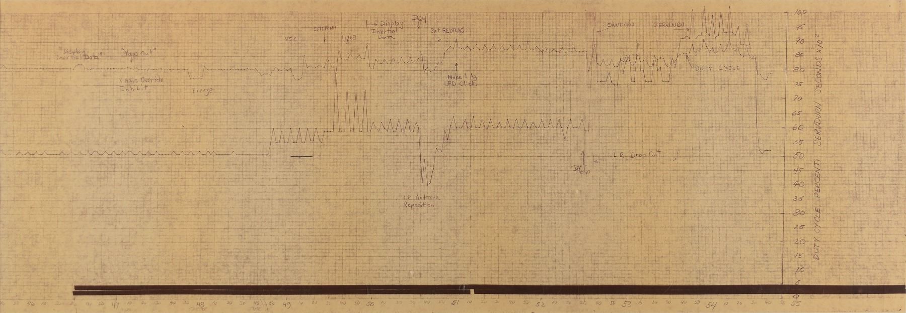 Chart of Apollo 14 dutycycle simulation data from Grumman, 71 x 11, plotting "Duty Cycle Percent" against "SERVDURN, Second x 102." The center of the plot reads: "Duty Cycle, (DUMLOOPS), Apollo 14 Descent on FMES/FCI Laboratory Simulator, H3-2 Check #2, 19 Mar 71, LUMINARY 1D (Rev 17B), Clint Tillman." Areas on the chart are marked with verb-noun commands (for example: V48, N46, N47, V83, V57), and notes identifying "Load Time," "Auto Trims," "Overwrite MODREG," "Drifting Flight Compensation," "DSKY Blanks," "Guidance In," "Start N69 (Too Early)," "Display Inertial Data," "X Axis Override Inhibit," and "LR Antenna Reposition." Rolled and in fine condition.