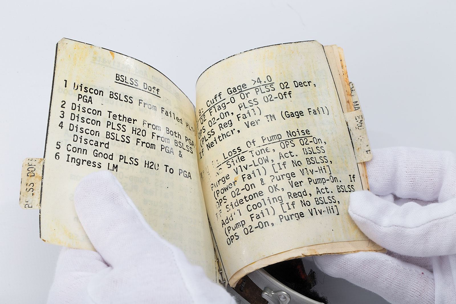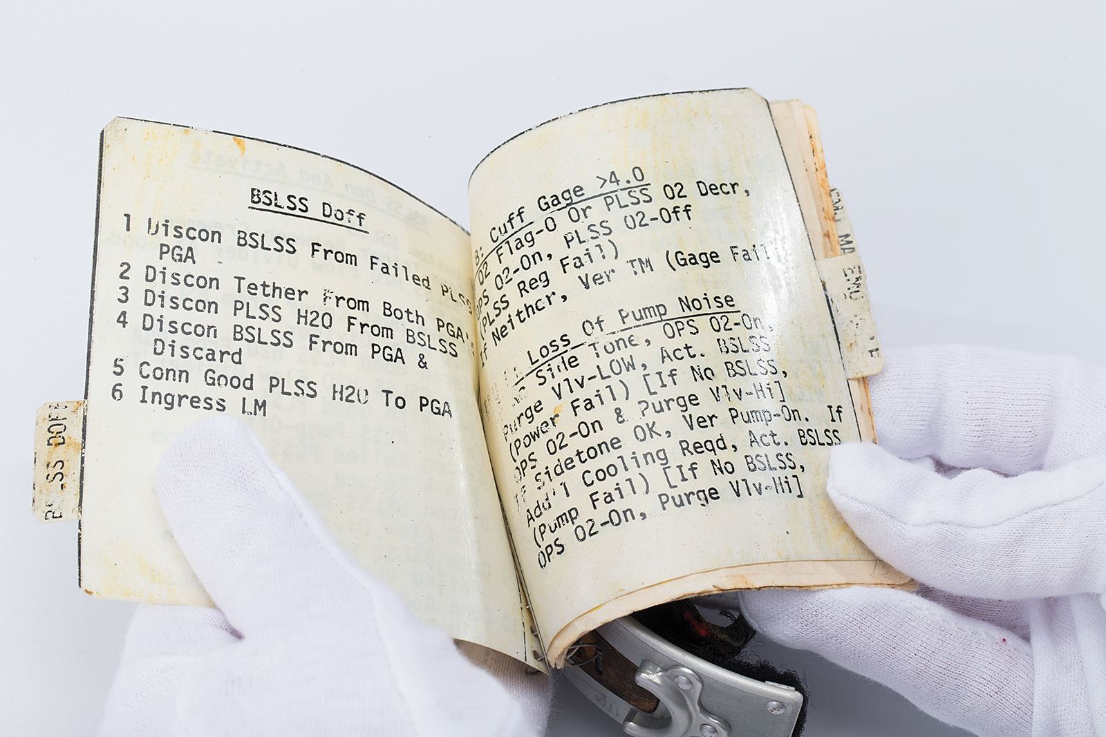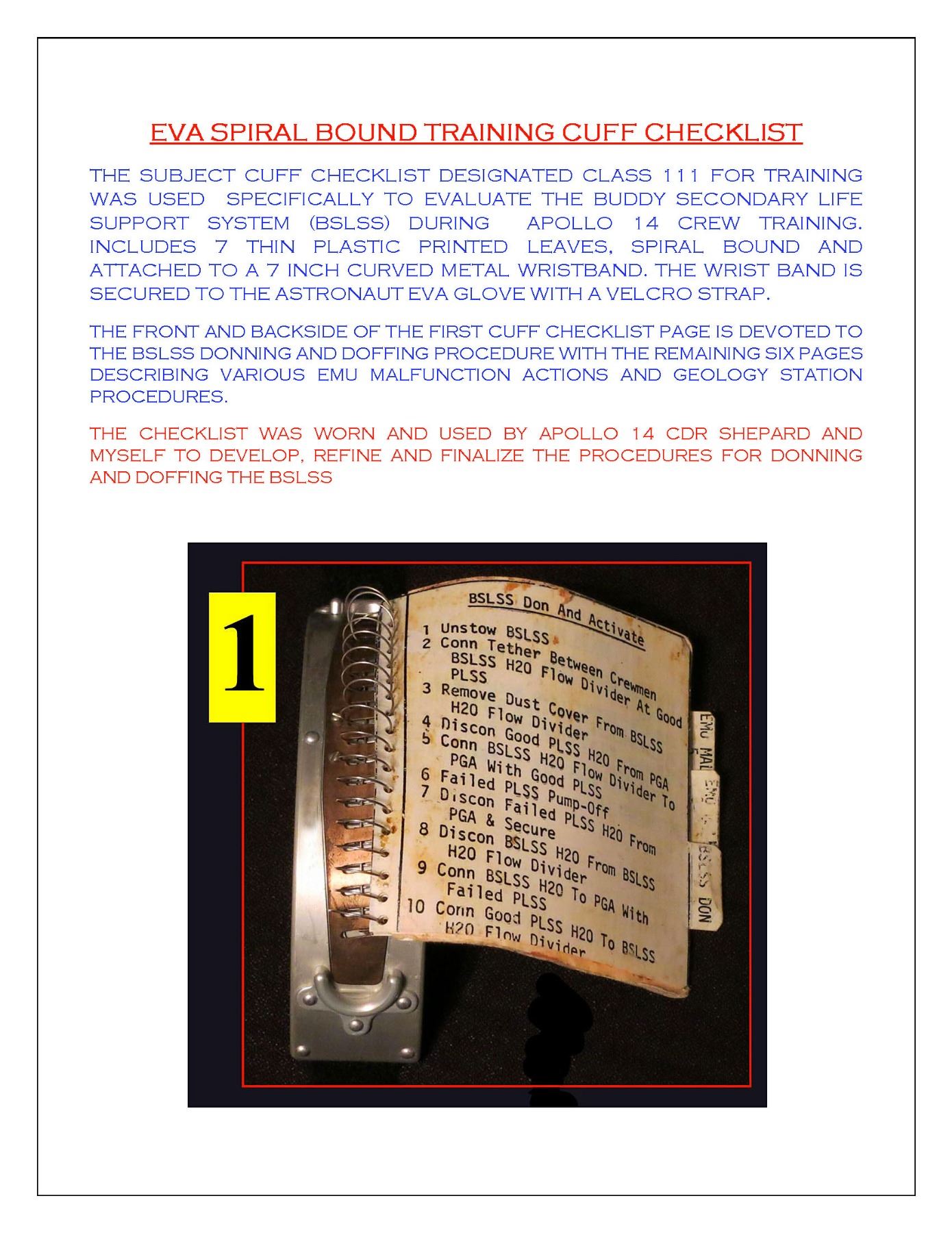 Spiral-bound training cuff checklist personally–worn and –used by Apollo 14 Commander Alan Shepard and KSC Engineer Dan Schaiewitz to develop, refine, and finalize the procedures for donning and doffing the Buddy Secondary Life Support System (BSLSS). The cuff checklist, designated as class 111 for training, includes eight thin 3.5 x 3.5 plastic printed pages (three dual-sided) attached to a 4.5? curved metal wristband with Velcro strap, which safely secured the cuff to the astronaut EVA glove. The front and backside of the first cuff checklist page is devoted to the BSLSS donning and doffing procedure with the remaining six pages describing various EMU malfunction actions and geology station procedures. The parts number on the wristband reads, “P/N SEB 33100302–302,” with “Class III” etched into the right side. In fine condition. Apollo 14 was the first mission to carry the BSLSS, which would have allowed an astronaut to share cooling water with his partner in the event of PLSS failure. As a piece worn by Shepard during his training to become the fifth man on the moon, this is a truly remarkable artifact of the American space program.