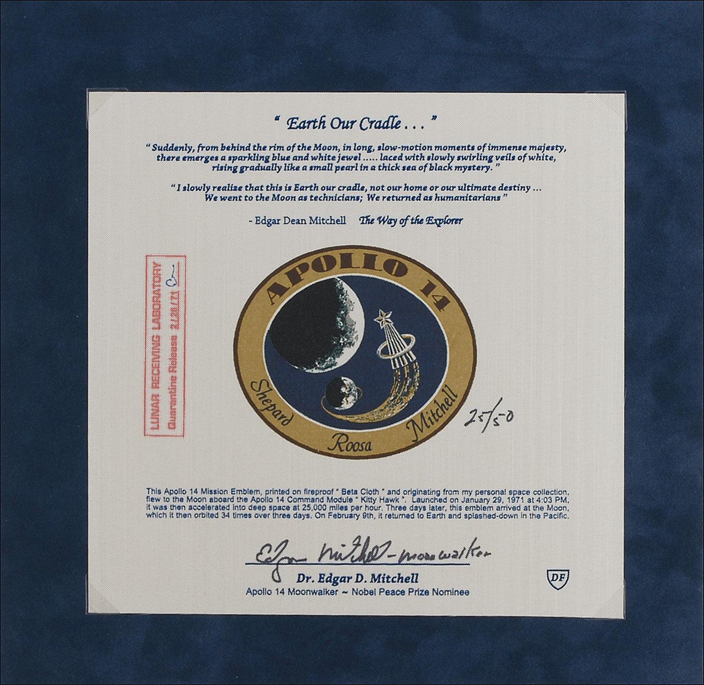 Copy number 25/50 mission emblem, 9 x 8.75, from the unique Apollo 14 flown limited edition entitled “Earth Our Cradle.” Flown to lunar orbit aboard the Apollo 14 Command Module ‘Kittyhawk’ where it then orbited the moon 34 times before returning to earth. The center of the Beta cloth bears the Apollo 14 mission emblem which was silk-screened on before the flight, and the text for “Earth our Cradle” which was silk-screened on after the flight to create the limited edition. In fine condition. Professionally and removably shrink wrapped on acid free board. Accompanied by a signed illustrated letter of provenance from Mitchell, which reads, in part: “Prior to the launch of Apollo 14, our crew’s mission patch was ‘silk-screened’ onto a small quantity of nine-square inch sections of white fireproof ‘Beta Cloth’…In August 2008, I participated in the creation of a unique limited edition entitled ‘Earth Our Cradle’ that utilized fifty of my Apollo ‘Beta Cloth’ mission patches. This may well be the very first time to date that an astronaut-approved limited edition has ever been created from a complete lunar artifact.”