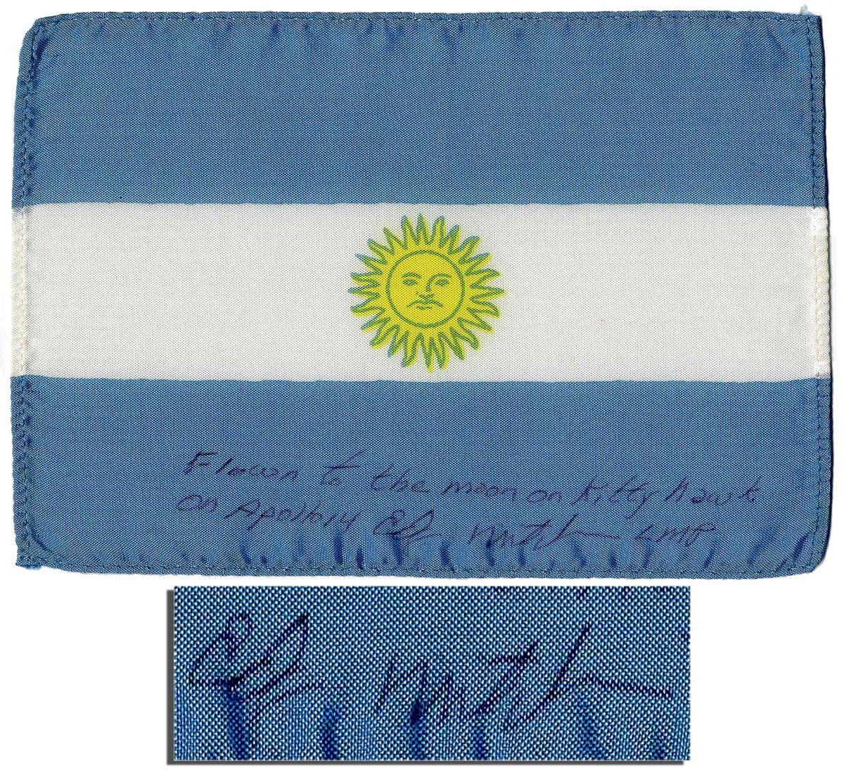 Apollo 14 flown Argentine flag, carried aboard the spacecraft Kittyhawk by its Lunar Module Pilot Edgar Mitchell. Blue and white 6'' x 4'' flag is signed ''Ed Mitchell LMP'' who additionally writes ''Flown to the moon on Kittyhawk on Apollo 14''. Mitchell also writes in the accompanying COA, ''The accompanying flag was flown aboard the spacecraft Kittyhawk on the Apollo 14 expedition to the moon which launched January 31, 1971…I hope that this historic piece will bring pleasure to viewers for many years…[signed] Edgar Mitchell''. Fine.