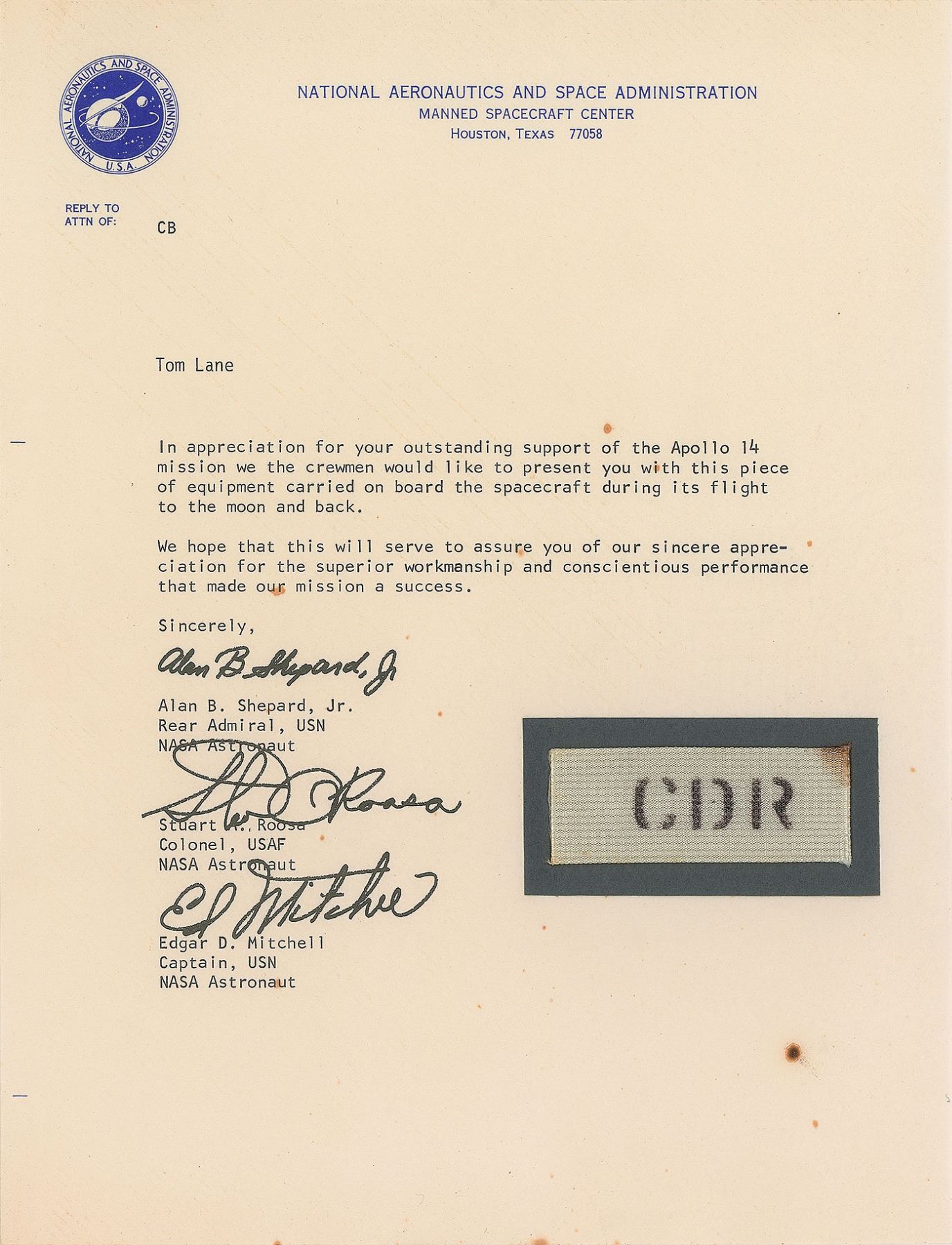 Desirable flown 2.5 x 1 swatch of fabric carried to the moon during the Apollo 14 mission, designated with black stenciling, “CDR,” and attached to a slightly larger black mount which is affixed to an off-white 8 x 10.5 sheet of NASA letterhead bearing facsimile signatures of the three Apollo 14 crew members. The sheet is presented to Tom Lane, in full: “In appreciation for your outstanding support of the Apollo 14 mission we the crewmen would like to present you with this piece of equipment carried on board the spacecraft during its flight to the moon and back. We hope that this will serve to assure you of our sincere appreciation for the superior workmanship and conscientious performance that made our mission a success.” In fine condition, with a few small stains. An appealing flown piece symbolic of the mission commander Alan Shepard, the first American to travel into space.