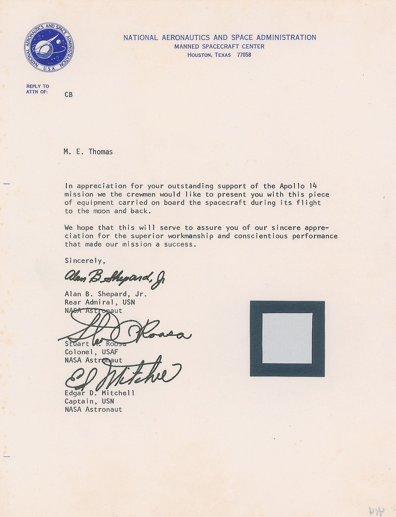 Flown 1 x 1 swatch of fabric carried to the moon during the Apollo 14 mission, attached to a slightly larger black mount which is affixed to an off-white 8 x 10.5 sheet of NASA letterhead bearing facsimile signatures of the three Apollo 14 crew members. The sheet is presented to M. E. Thomas, in full: “In appreciation for your outstanding support of the Apollo 14 mission we the crewmen would like to present you with this piece of equipment carried on board the spacecraft during its flight to the moon and back. We hope that this will serve to assure you of our sincere appreciation for the superior workmanship and conscientious performance that made our mission a success.” In fine condition.