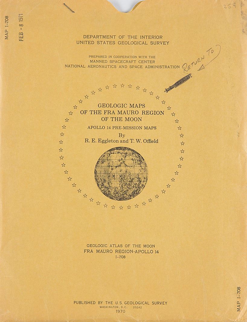 Appealing pair of color Apollo 14 pre-mission geological maps of the Fra Mauro region of the moon by R. E. Eggleton and T. W. Offield, published by the US Geological Survey in 1970. The first map, 27.5 x 46, scale 1:25,000, shows the geology of the Far Mauro site, with a red pencil annotation identifying the landing site for the Apollo 14 mission. The second map, 41 x 23, scale 1: 250,000, displays the regional geologic setting of the Apollo 14 landing area in the western part of the lunar equatorial belt. Both maps include their respective information packets and their original Department of the Interior, United States Geological Survey (Map I-708) storage folder; the maps, packets, and folder are each stamped “Feb 8, 1971, J. L. Seright.” In overall fine, folded condition.