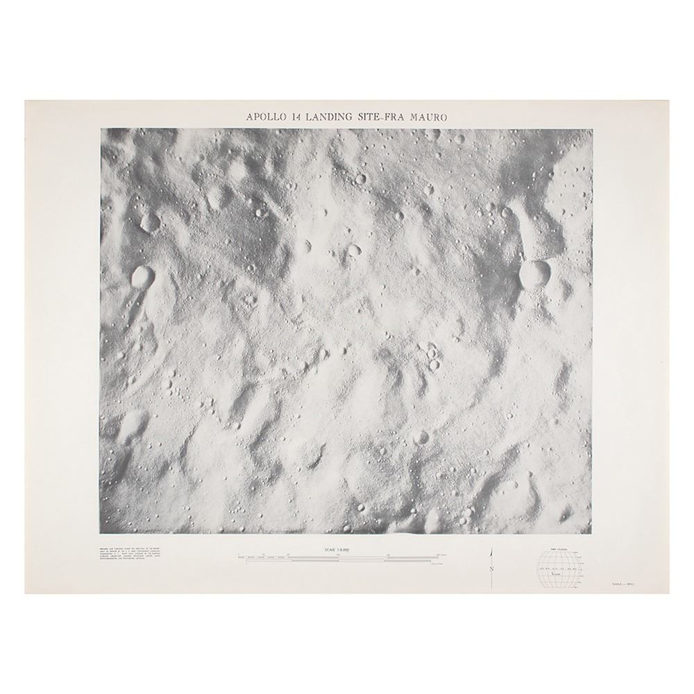 Uncommon NASA shaded relief chart for the "Apollo 14 Landing Site-Fra Mauro," scale 1:8,000, 22 x 17, which depicts an overhead view of the impressive Fra Mauro formation, the landing site of the third successful moon-landing mission. The exact landing spot of the Lunar Module Antares can be discerned by a small faint 'x' just right of the chart's center. Prepared by the U.S. Army Topographic Command under the direction of the Department of Defense. In fine condition.