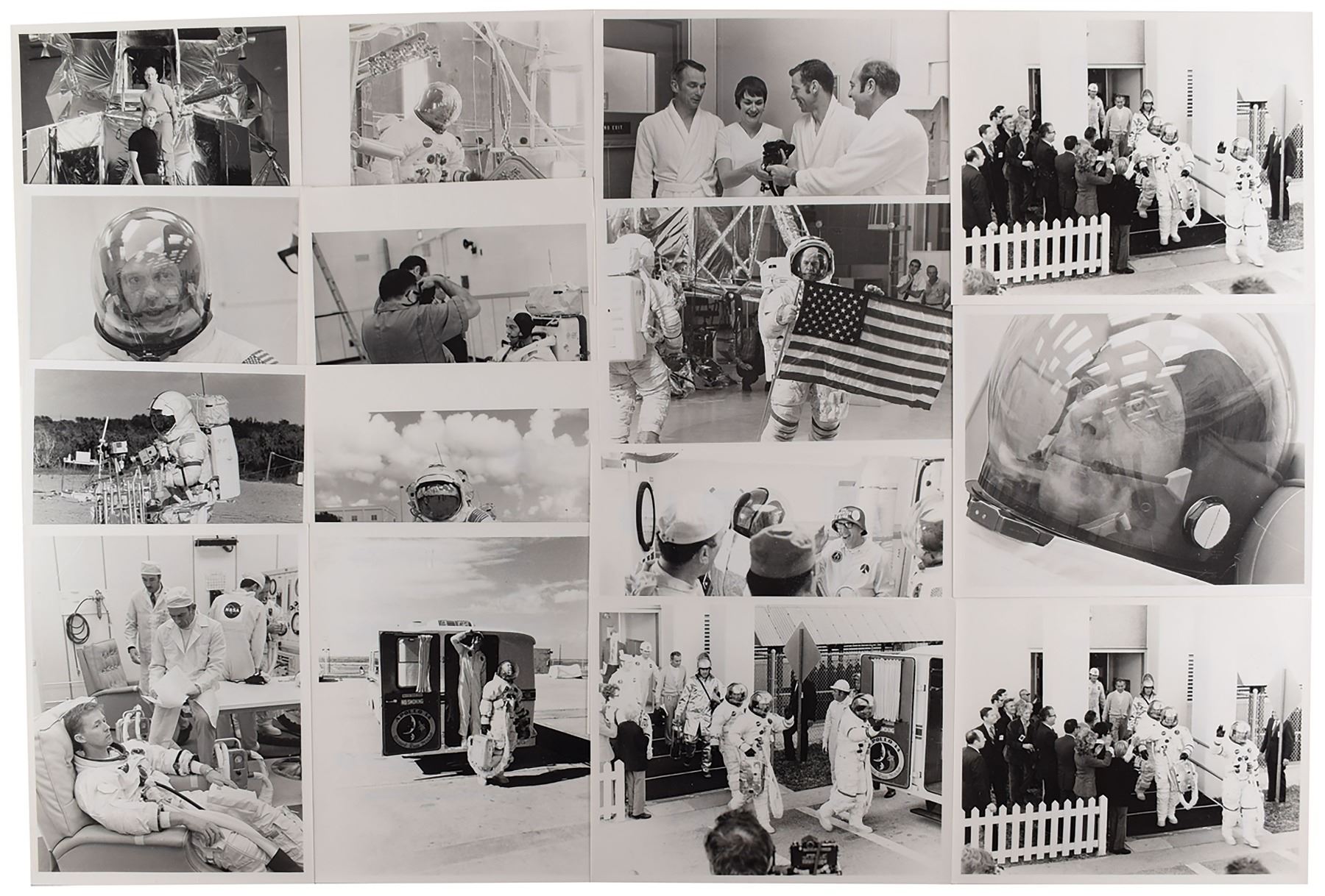 Group lot of 15 vintage original NASA photographs from the Apollo 14 mission, each glossy finished, 8 x 10 and 10 x 8, with the majority bearing purple NASA caption text on reverse. The bulk of the photos document preflight training exercises and pictures of the prime crew waiting in their space suits mere hours before liftoff. Images include: an uncommon crew portrait of Alan Shepard, Stuart Roosa, and Edgar Mitchell posing together on a lunar lander; an armadillo joining Shepard as he checks items on a modular equipment carrier during EVA training; Shepard deploying the American flag during a suited training exercise; the prime crew as they embark on their nine-mile ride to Launch Complex 39A; backup LMP Joe Engle using a 'thumper' during EVA training; and the backup crew of Gene Cernan, Ron Evans, and Engle speaking with nurse Dee O'Hara. In overall fine condition, with some slight wear to edges.