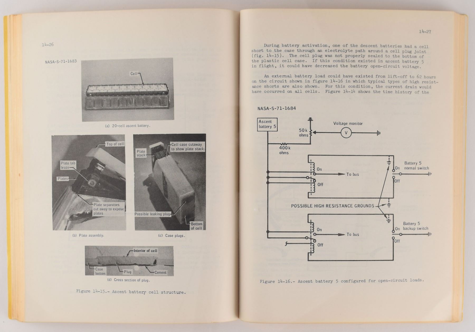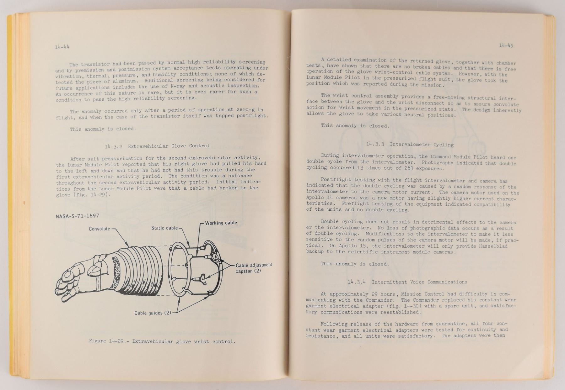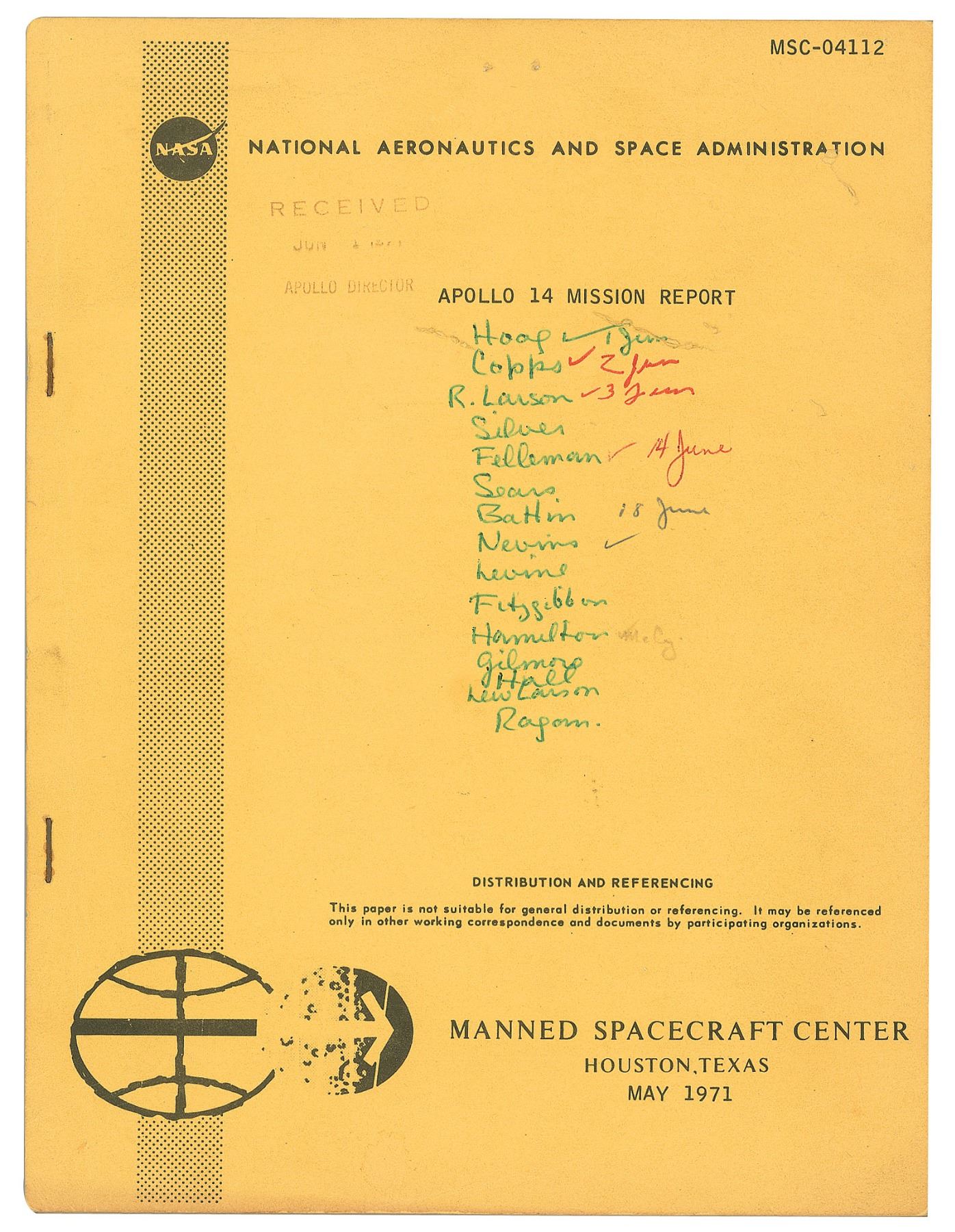 Staple-bound official Apollo 14 Mission Report (MSC-04112) published by NASA's Manned Spacecraft Center, 8 x 10.5, May 1971, with the front cover stamped, "Received, June 1 1971, Apollo Director," and annotated in ballpoint with a list of 15 surnames of members of Draper Laboratory, including those of Margaret Hamilton, Richard Battin, David Hoag, Russ Larson, and George Silver. The report offers numerous charts, summaries, and images associated with Apollo 14's "Lunar Surface Experiments," "Lunar Orbital Experiments," "Inflight Demonstrations," "Trajectory," "Command and Service Module Performance," "Lunar Module Performance," "Pilot's Report," "Biomedical Evaluation," "Mission Support Performance," "Assessment of Mission Objectives," "Launch Phase Summary," and "Anomaly Summary." In fine condition, with a crease to the corner of the front cover.