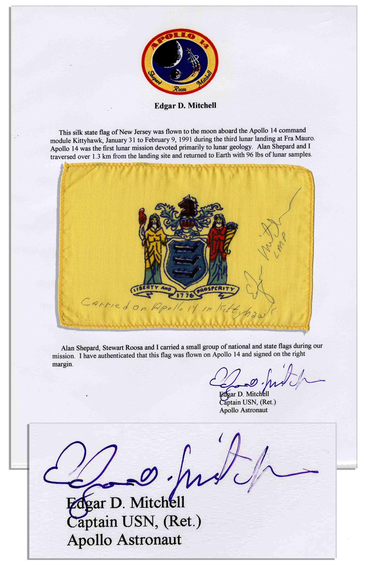 Apollo 14 flown New Jersey state flag, carried aboard the spacecraft Kittyhawk by its Lunar Module Pilot Edgar Mitchell. Yellow 6'' x 4'' silk flag is signed ''Edgar Mitchell LMP'' who additionally writes ''Carried on Apollo 14 in Kittyhawk''. Mitchell also writes in the accompanying COA, ''This silk state flag of New Jersey was flown to the moon…January 31 to February 9, 1991 [sic] during the third lunar landing at Fra Mauro. Apollo 14 was the first lunar landing mission devoted primarily to lunar geology…[signed] Edgar D. Mitchell''. Fine.