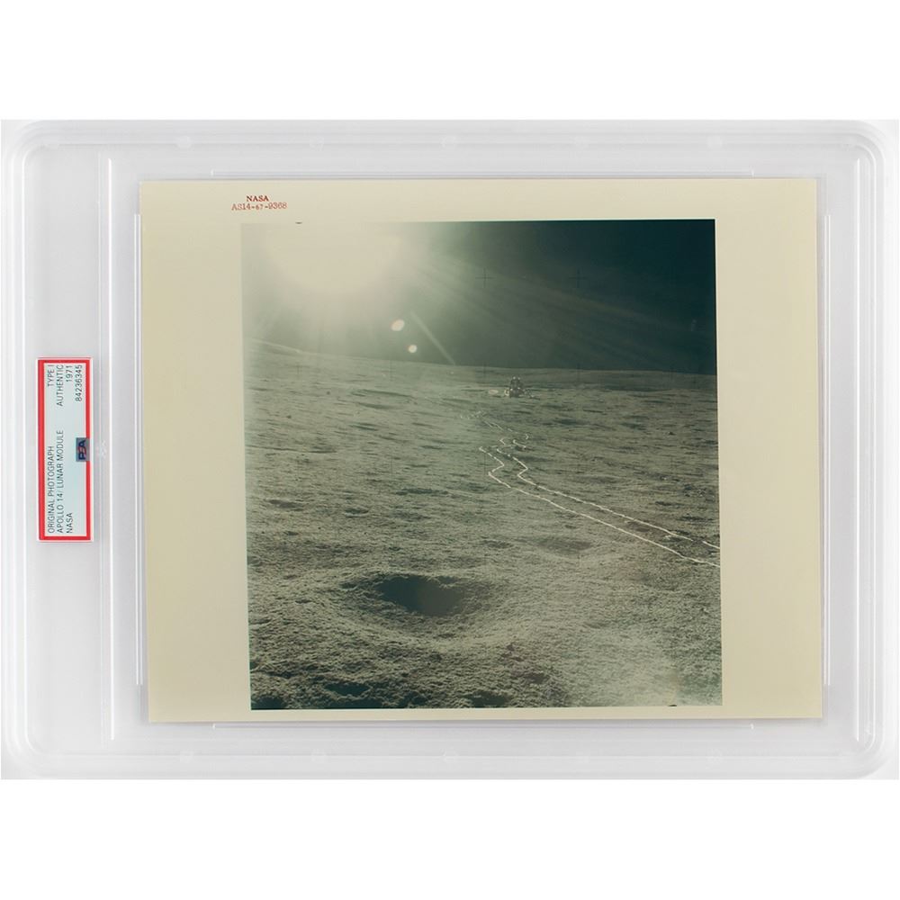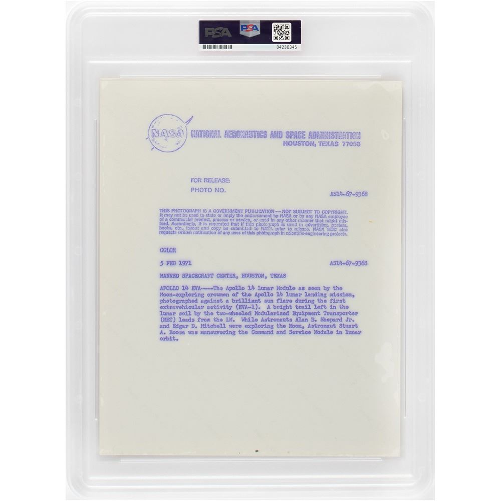 Official color glossy 10 x 8 red-numbered NASA photo (AS14-67-9368), which shows the Apollo 14 Lunar Module photographed against a brilliant sun flare. Reverse bears "A Kodak Paper" watermarks and purple NASA caption text. In very fine condition. Encapsulated by PSA as an authentic 'Type I' photograph. From The Gene Kranz Collection. Kranz served as a flight director for Apollo 14.