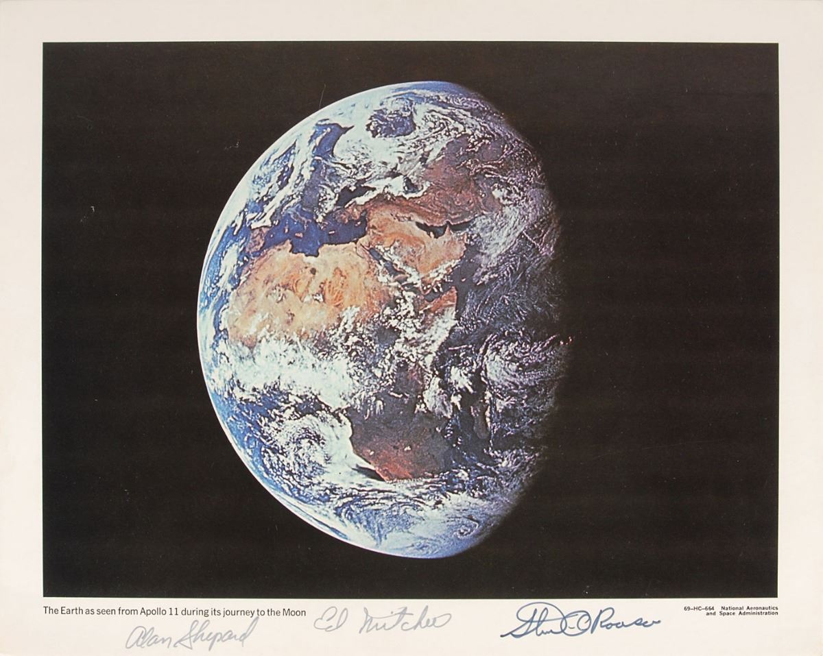 Uncommon oversized official color 14 x 11 NASA lithograph of planet Earth, signed in the lower border in black felt tip, “Alan Shepard,” “Ed Mitchell,” and “Stu A. Roosa.” In fine condition.