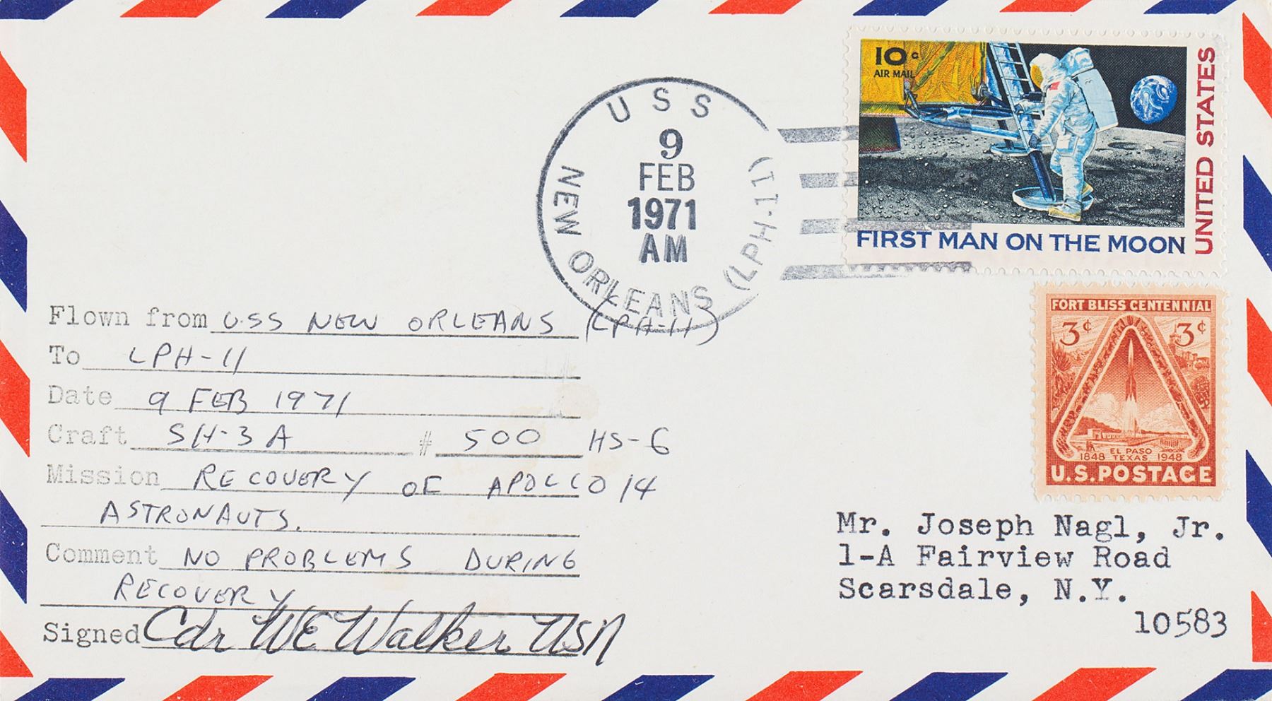 Cover flown on the helicopter dispatched from the USS New Orleans to recover the Apollo 14 astronauts in the South Pacific Ocean, postmarked on the New Orleans on the recovery date, February 9, 1971, with a cachet filled out in ballpoint: "Flown from USS New Orleans (LPH-11) To LPH-11, Date: 9 Feb 1971, Craft: SH-3A #500 HS-6, Mission: Recovery of Apollo 14 Astronauts, Comment: No Problems During Recovery." Signed below by the pilot, "Cdr. W. E. Walker USN." In fine condition. Accompanied by two notes by the original sender, Barbara J. Baker, one at the top of a photocopy of a note from Cdr. Walker authenticating the cover. Baker writes: "I sent 4 covers to Cdr. Walker to be flown on his helicopter during the recovery of the Apollo-14 crew."