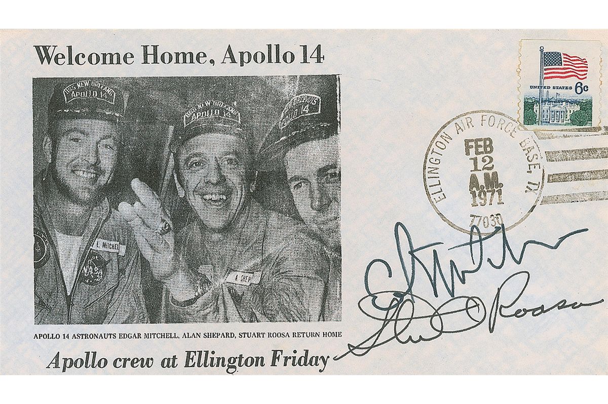 Commemorative cover with a cachet honoring the arrival of the Apollo 14 crew at Ellington Air Force Base, signed in black felt tip by Edgar Mitchell and Stuart Roosa. In fine condition.
