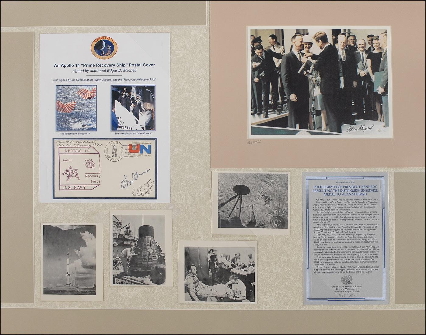 Two items: Apollo 14 prime recovery ship commemorative cover, bearing a cachet honoring the Apollo 14 recovery force, signed in blue ink by Edgar Mitchell and also signed by two members of the recovery force; and a limited edition color 10 x 8 cardstock photo of President Kennedy presenting the Distinguished Service Medal to Shepard, numbered 1162/2500, signed in black felt tip by Shepard. Photo is matted to an overall size of 14 x 11. Both items are shrink-wrapped to a mount, along with four snapshot photos from Shepard’s Mercury mission, and a descriptive sheet for his photo, to an overall size of 28 x 22. In fine condition.