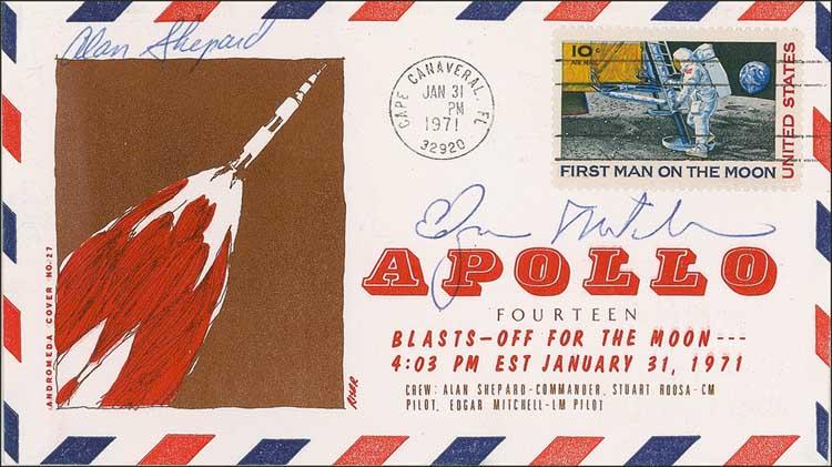 Apollo 14 commemorative launch cover with a cachet honoring the launch of Apollo 14, signed on the front in blue ballpoint by Alan Shepard and Edgar Mitchell. In very fine condition. Pre-certified Scott Cornish and RRAuction COA.