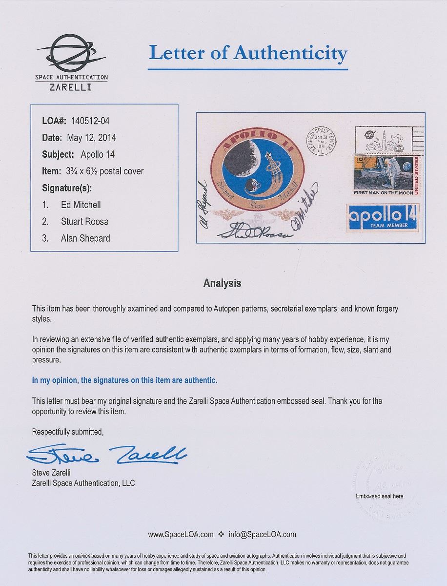 Desirable Apollo 14 launch day cover with a ‘Bishop’ cachet of the mission insignia and three military wings below, signed in black felt, “Al Shepard,” “Stu A. Roosa,” and “Ed Mitchell.” The cover is affixed with an “Apollo 14 Team Member” label in the lower right corner. In fine condition. Accompanied by a full letter of authenticity from Zarelli Space Authentication. Although similar to an insurance cover, this particular example bears an affixed ‘First Man on the Moon’ stamp, as opposed to the officially assigned Apollo 8 ‘Earthrise’ stamp, indicating that these signatures were likely signed post-recovery. A unique and visually enticing cover signed by the entire mission crew.