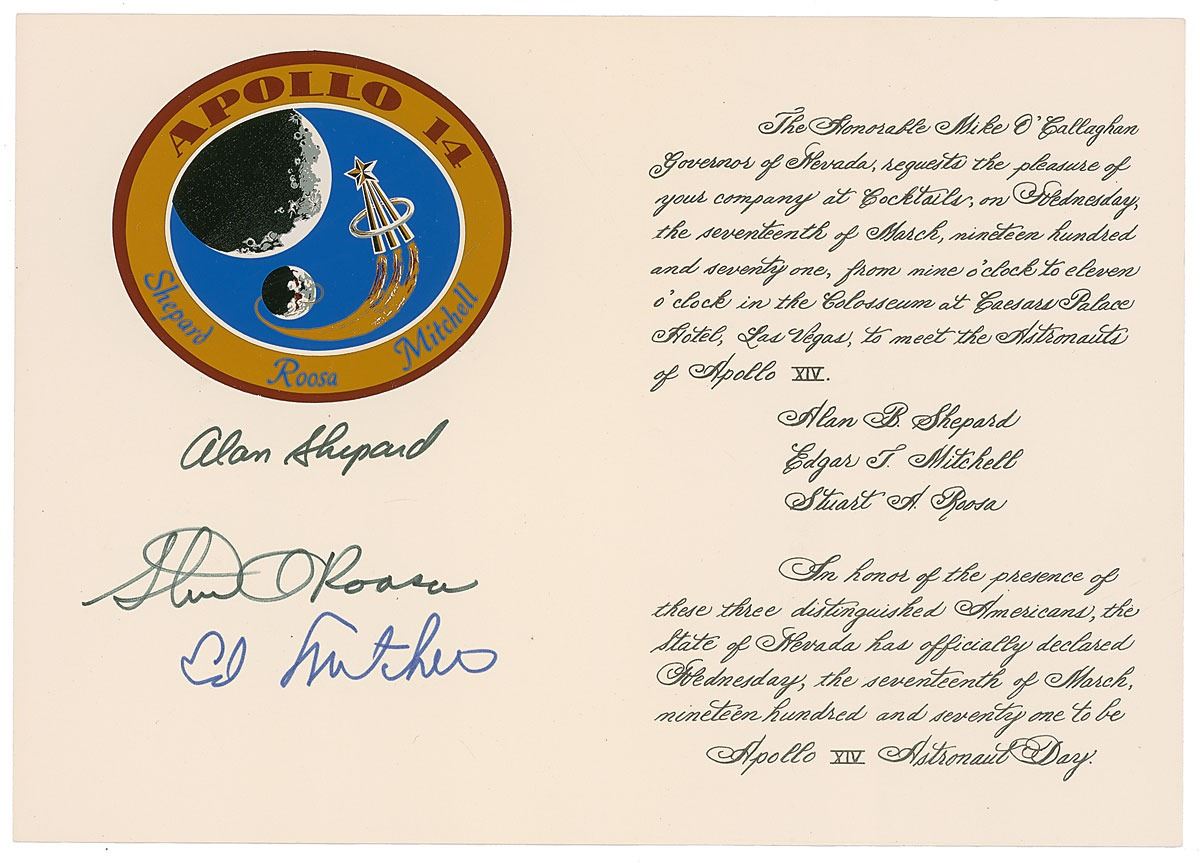 Invitation to a cocktail reception held in honor of the Apollo 14 crew at the Colosseum at Caesar's Palace Hotel in Las Vegas on March 17, 1971, 10.25 x 7.25, signed on the left side under a mission emblem sticker in felt tip by Alan Shepard, Stu Roosa, and Edgar Mitchell. In fine condition.
