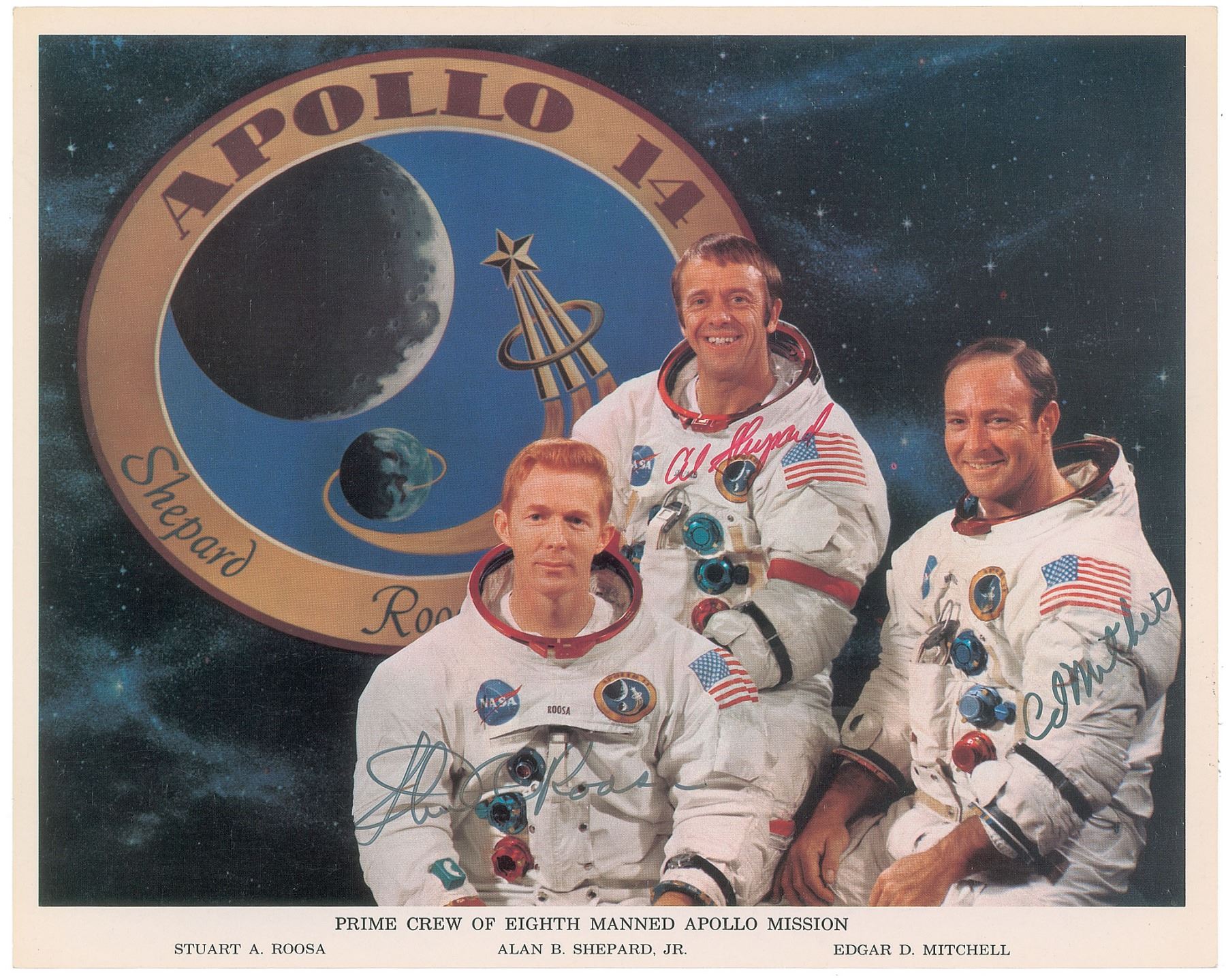 Official color 10 x 8 NASA lithograph of the Apollo 14 crew posing in their white space suits in front of their mission insignia, signed in red felt tip, "Alan Shepard," and in black felt tip, "Ed Mitchell" and "Stu A. Roosa." In fine condition. A desirable, uninscribed example of the full crew.