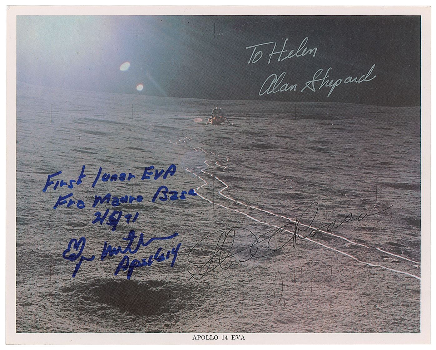 Official color 10 x 8 NASA lithograph of a sun-coated lunar surface with two-wheeled trail leading to the Apollo 14 lunar module, signed and inscribed in silver ink, "To Helen, Alan Shepard," in black felt tip, "Stu A. Roosa," and in blue felt tip, "First lunar EVA, Fra Mauro Base, 2/5/71, Edgar Mitchell, Apollo 14.” In very good to fine condition, with scattered light creasing, and a very light second Mitchell signature beneath Roosa's.