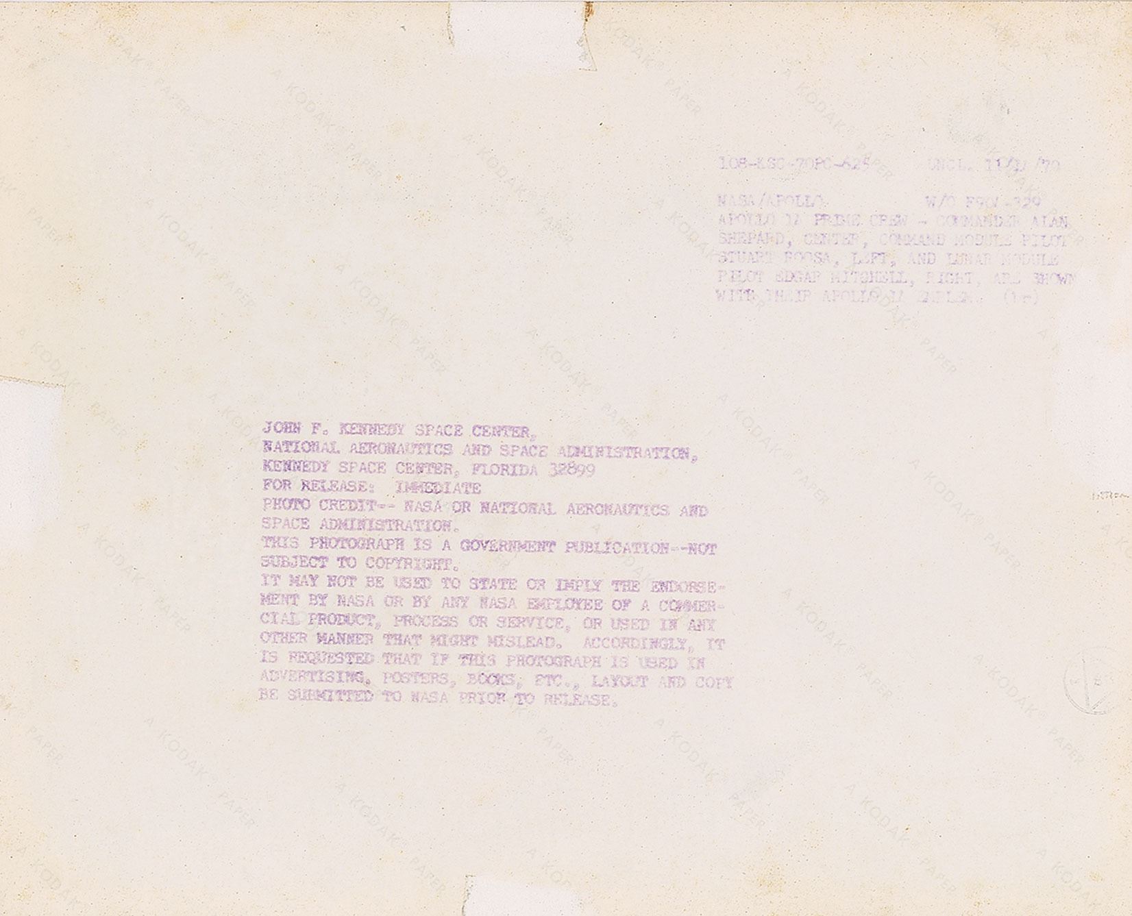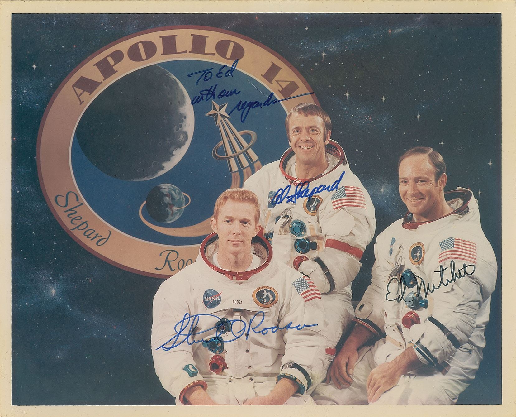 Official color glossy 10 x 8 NASA photo of the Apollo 14 crew posing in their white space suits against a large mission emblem, signed and inscribed in blue felt tip, "To Ed, with our regards, Al Shepard" and "Stu A. Roosa," and in black felt tip, "Ed Mitchell.” Reverse bears faded NASA caption text and "A Kodak Paper" watermarks. In fine condition, with surface loss to reverse upper edge, and a small crease to inscription.